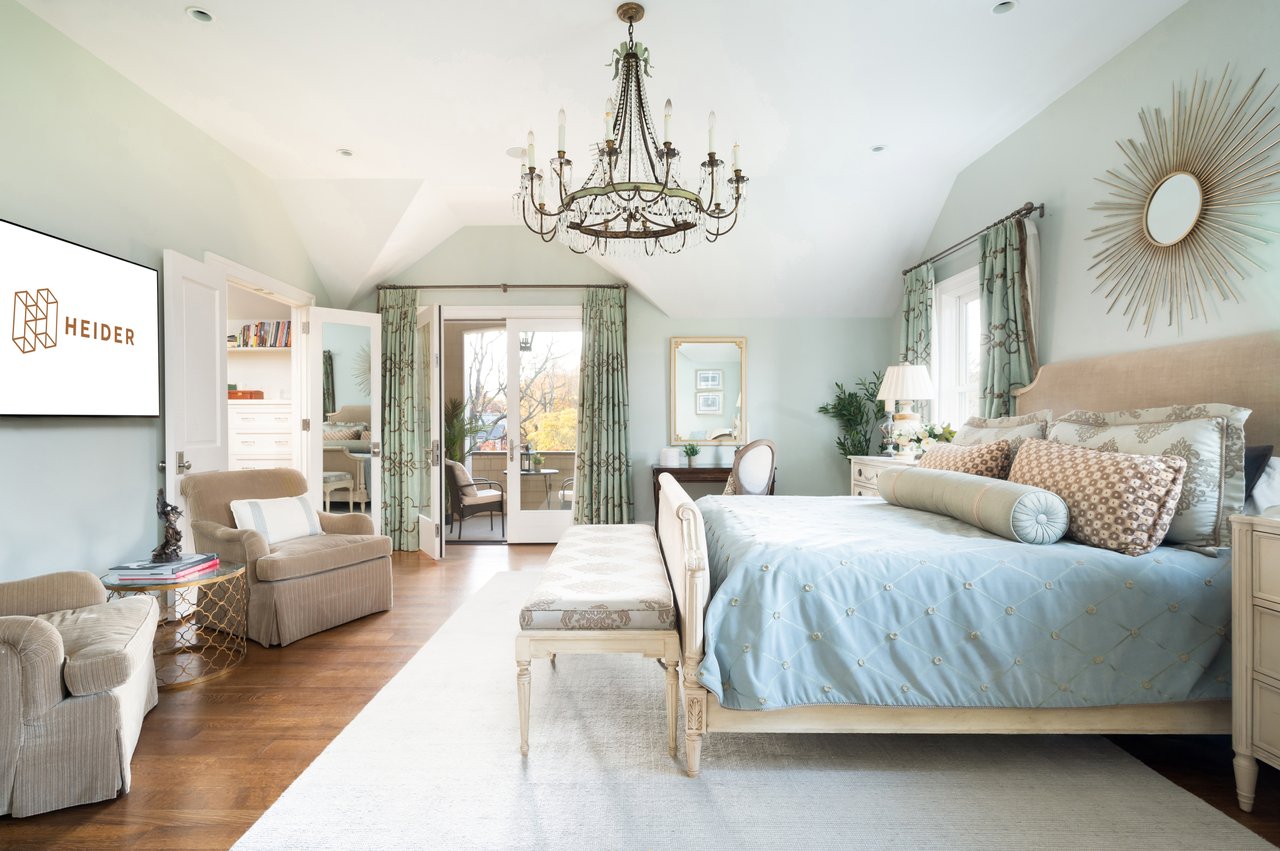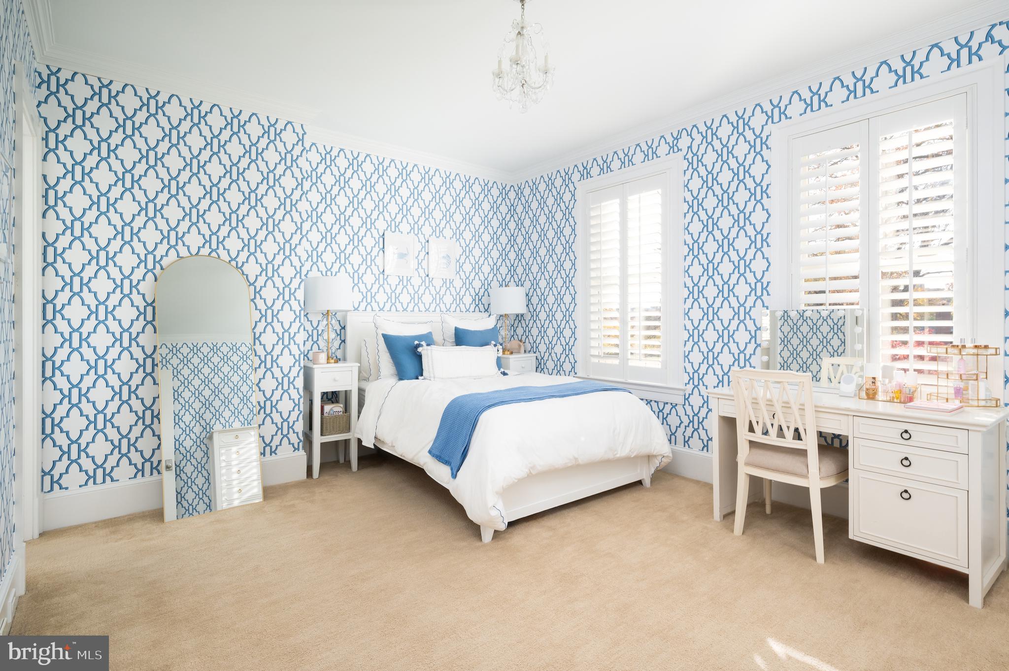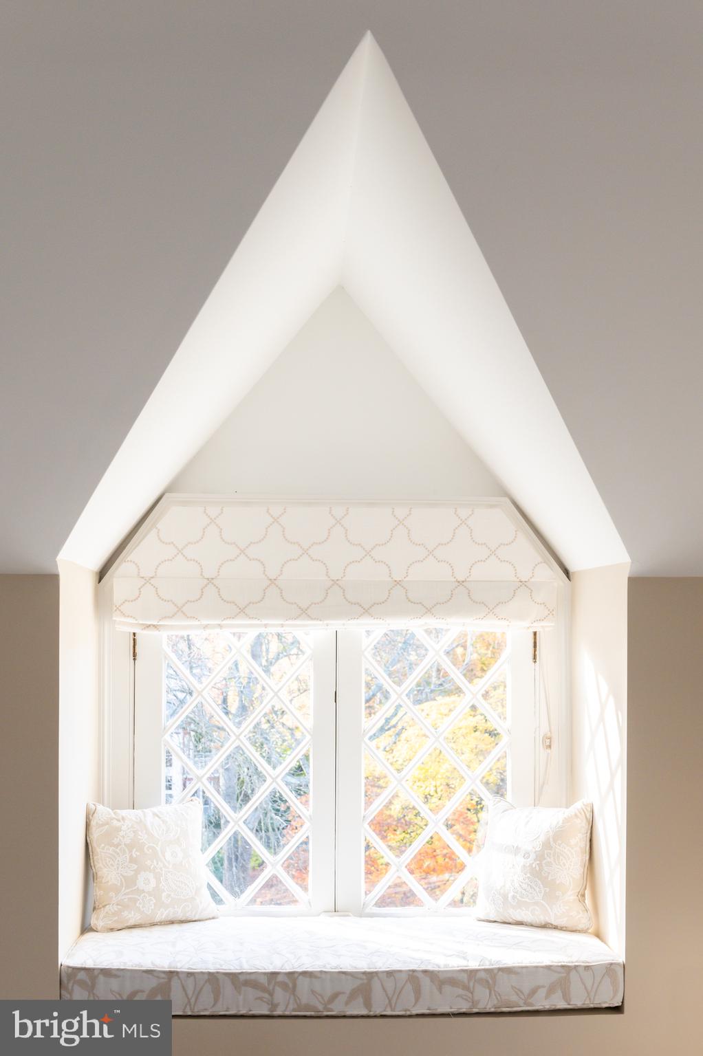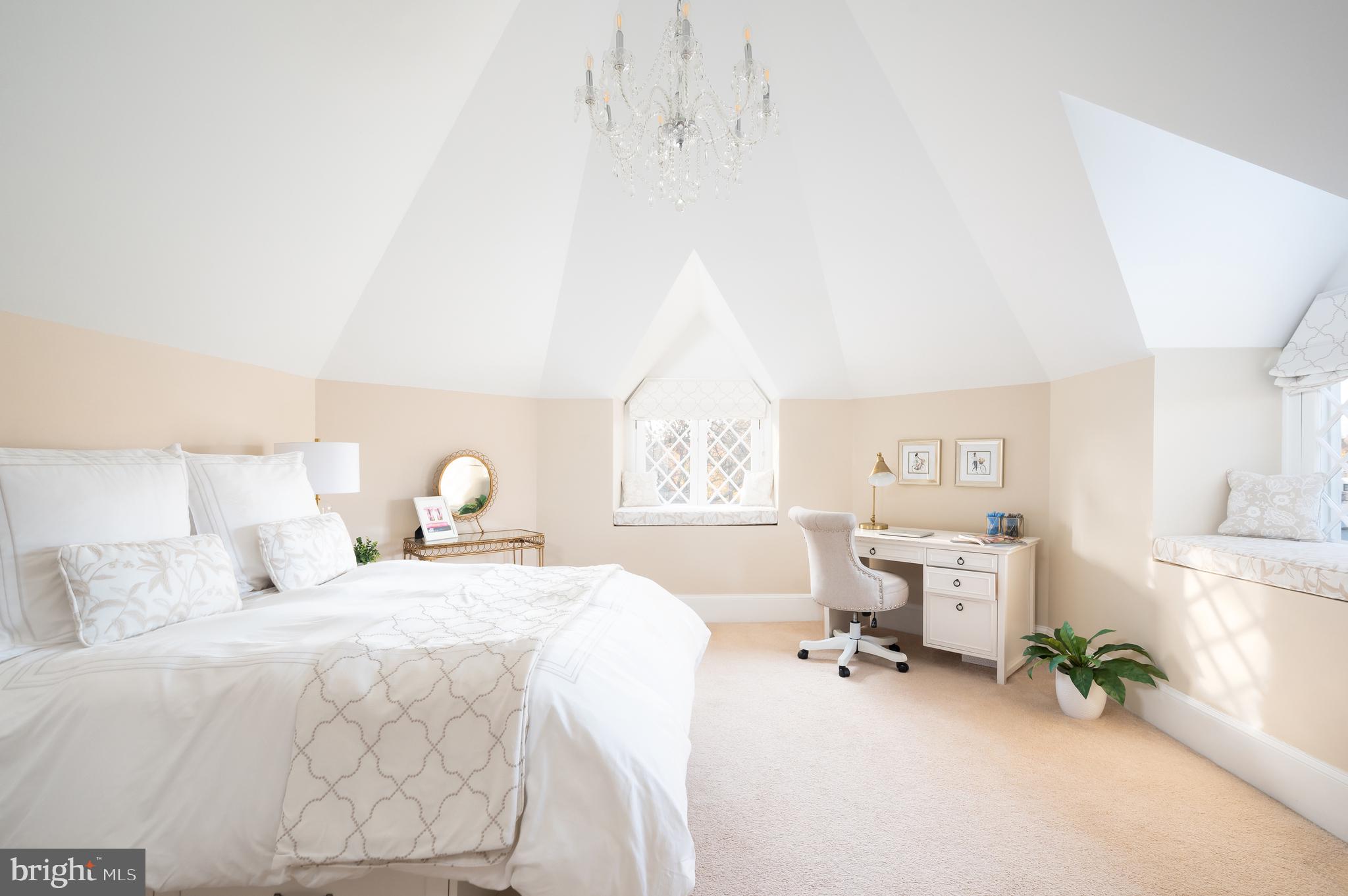 The second level is highlighted by a private primary suite that offers a serene retreat. Features include a covered terrace with sweeping views, a luxurious five-piece marble spa bath, and a spacious dressing room with custom built-ins. Secondary bedrooms are thoughtfully designed with unique architectural details and en-suite marble baths. On the top level, a turret room with mullioned windows provides a versatile space, perfect for a fitness studio or creative retreat.