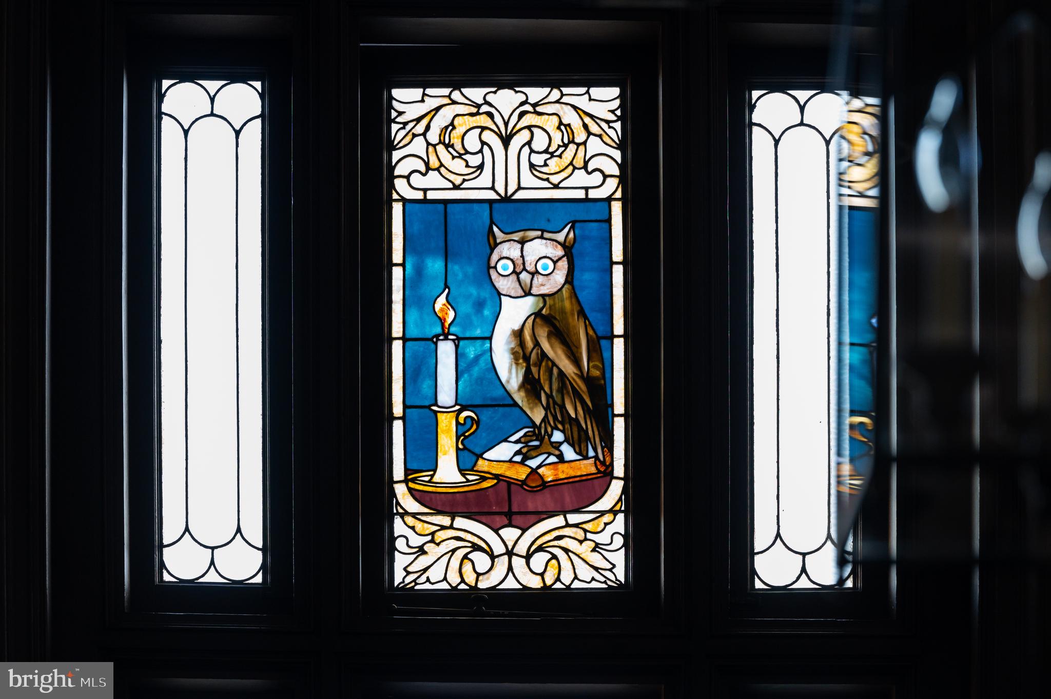 The estate's striking exterior, clad in oversized local stone and accentuated by thick mortar, showcases the timeless allure of the shingle style. With its elegant curves, distinctive gables, and turret, The Owl's Nest boasts a commanding curb appeal that is both unique and unforgettable. A deeply recessed entrance framed by a graceful stone archway leads to the grand foyer, where the original wood-paneled staircase has been lovingly restored. A stunning stained-glass window depicting an owl adds a touch of enchantment, glowing softly when backlit at night.