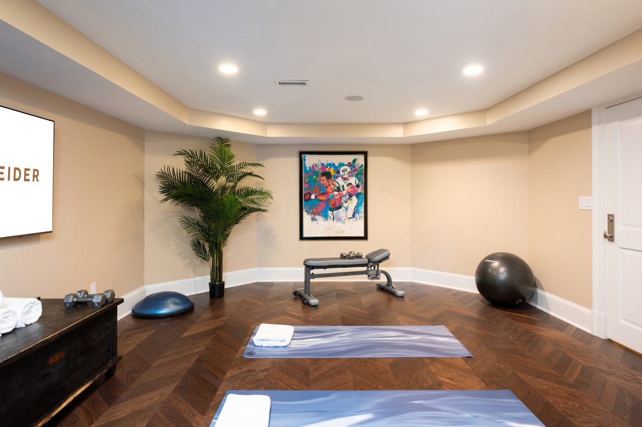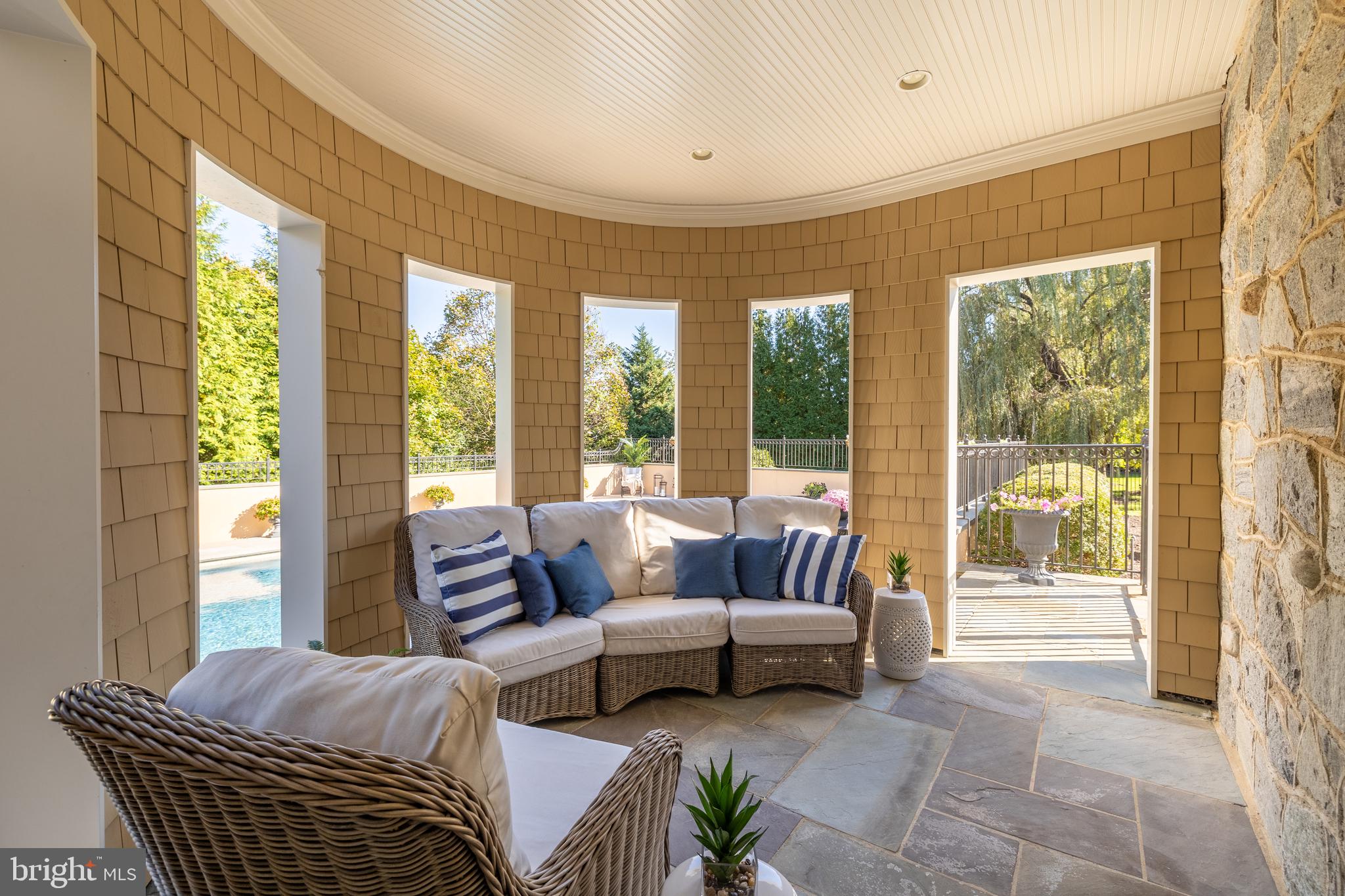 The lower level invites relaxation with a lounge anchored by a dramatic stone fireplace, leading to two covered outdoor porches. Additional spaces include a recreation room, a private den, ample storage, and a full bath.
