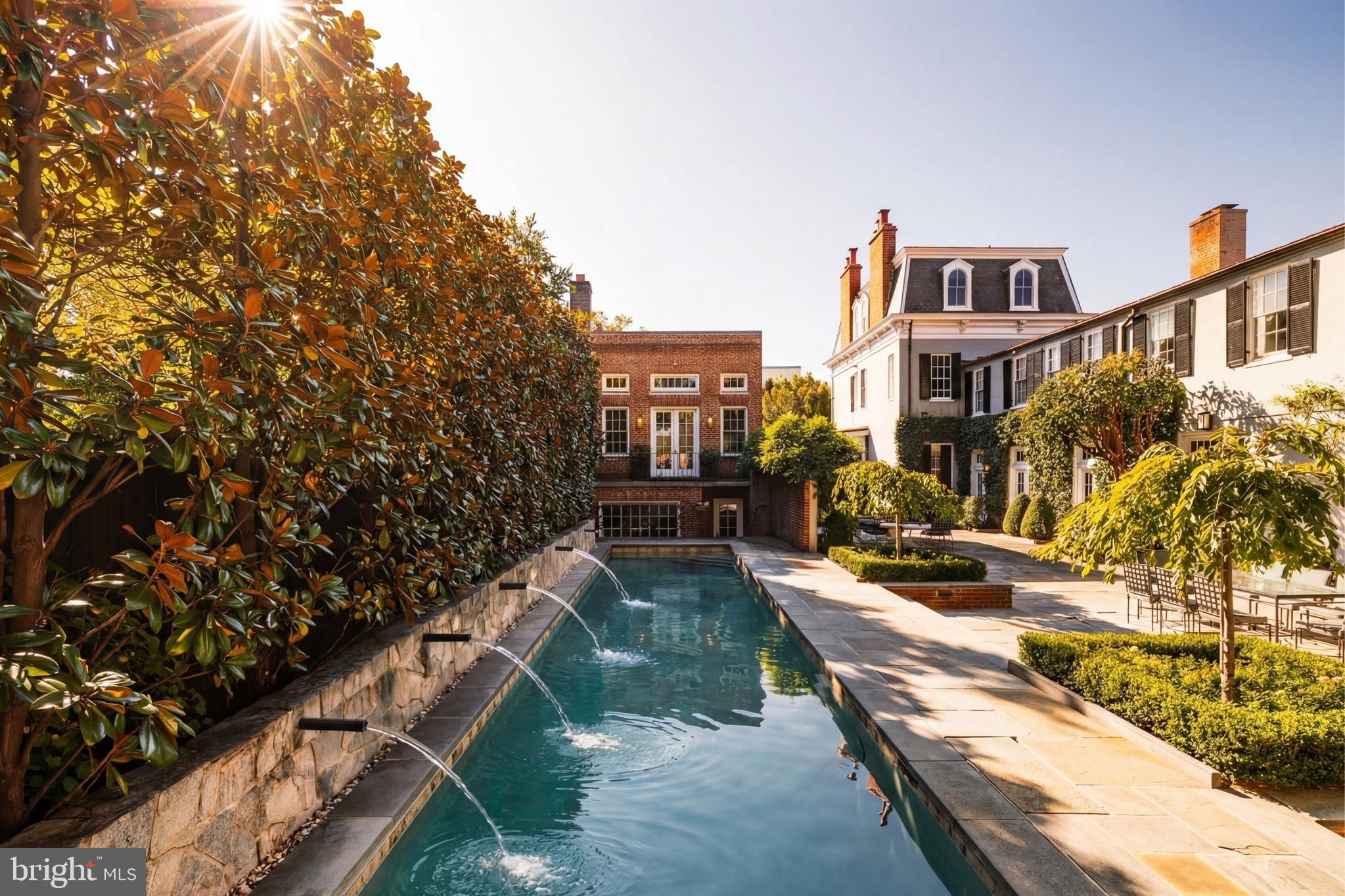 Outdoor living is a defining feature of the property. The private, landscaped courtyard is centered around a lap pool with an automatic cover and is complemented by fountains, flagstone patios, and an outdoor kitchen, forming a tranquil retreat rarely found in the heart of the city.