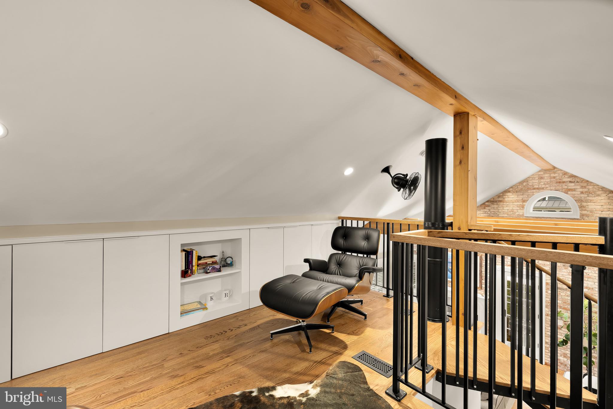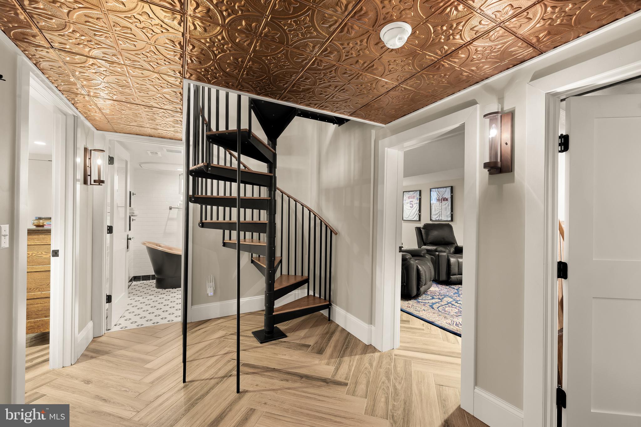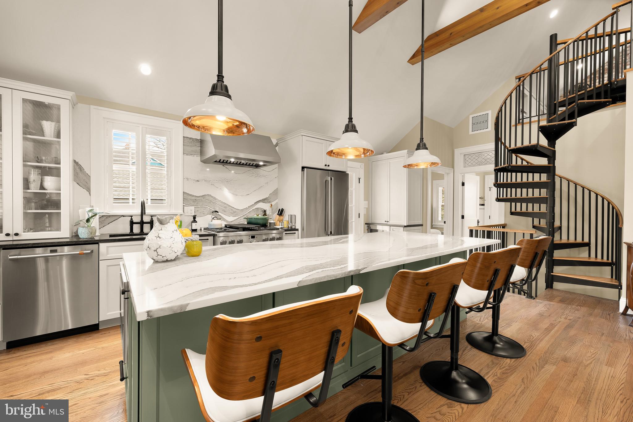 A spiral staircase with oak treads and a copper railing serves as a striking architectural focal point, connecting the main level to a lofted home office above.