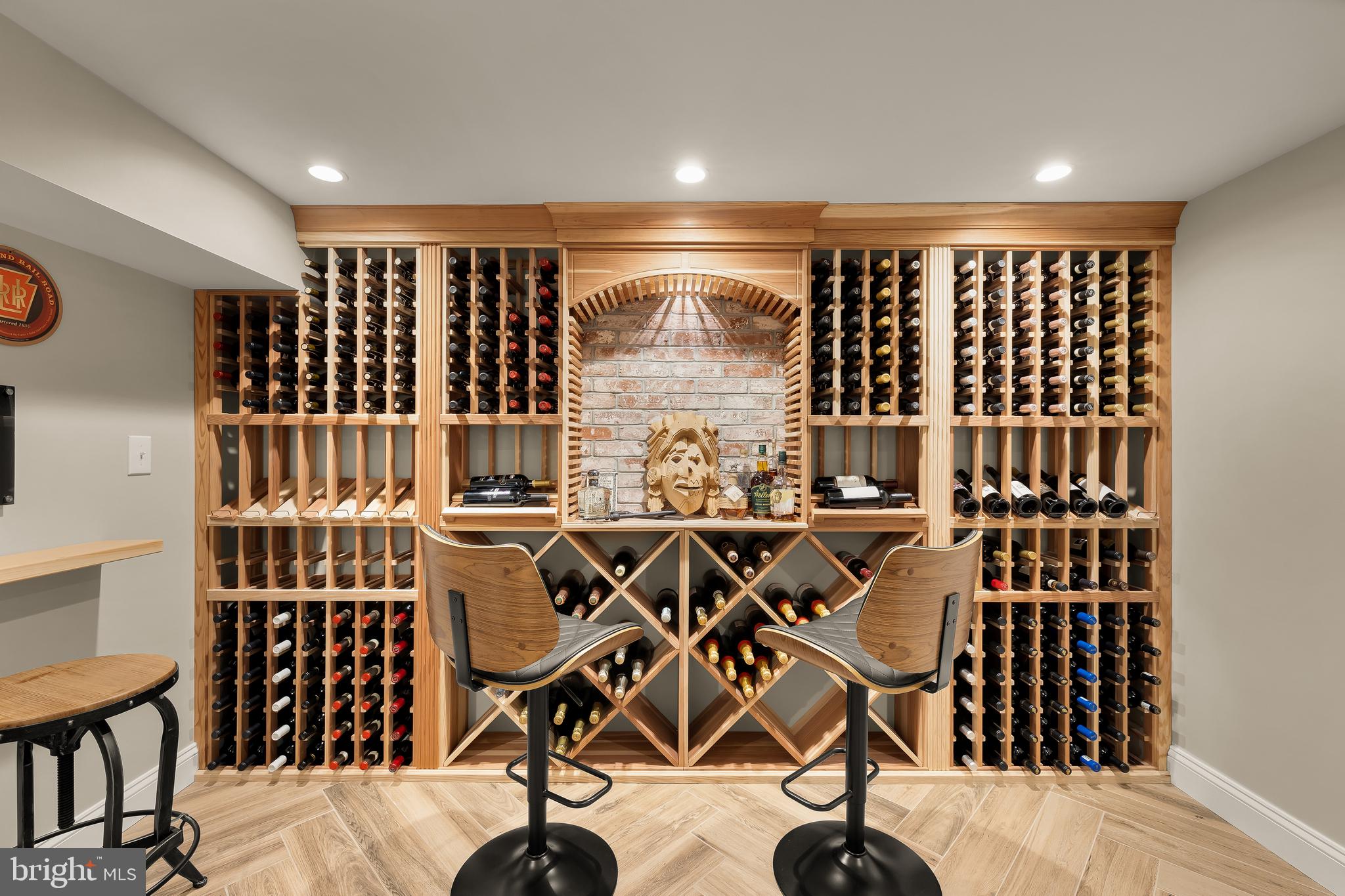 Vaulted ceilings, exposed brick walls, and cedar beams in the main living space create an ethereal sensation of depth. The centerpiece is a stunning custom limestone and concrete fireplace mantel by Artisan Kraft, while an ambient glow emanates overhead from LED lighting embedded within the ceiling beams. Likewise, another highlight is the den, complete with built-in cabinetry, a wet bar with a unique American Tin Ceiling copper backsplash and hammered copper sink, as well as a spectacular 250-bottle wine cellar complete with custom shelving.