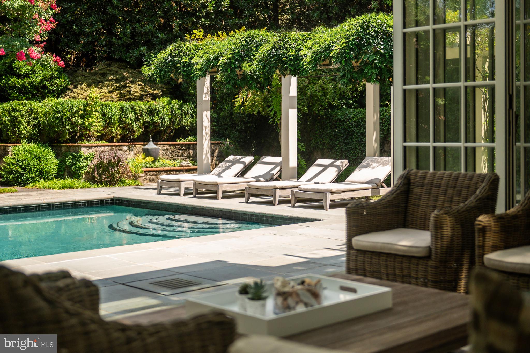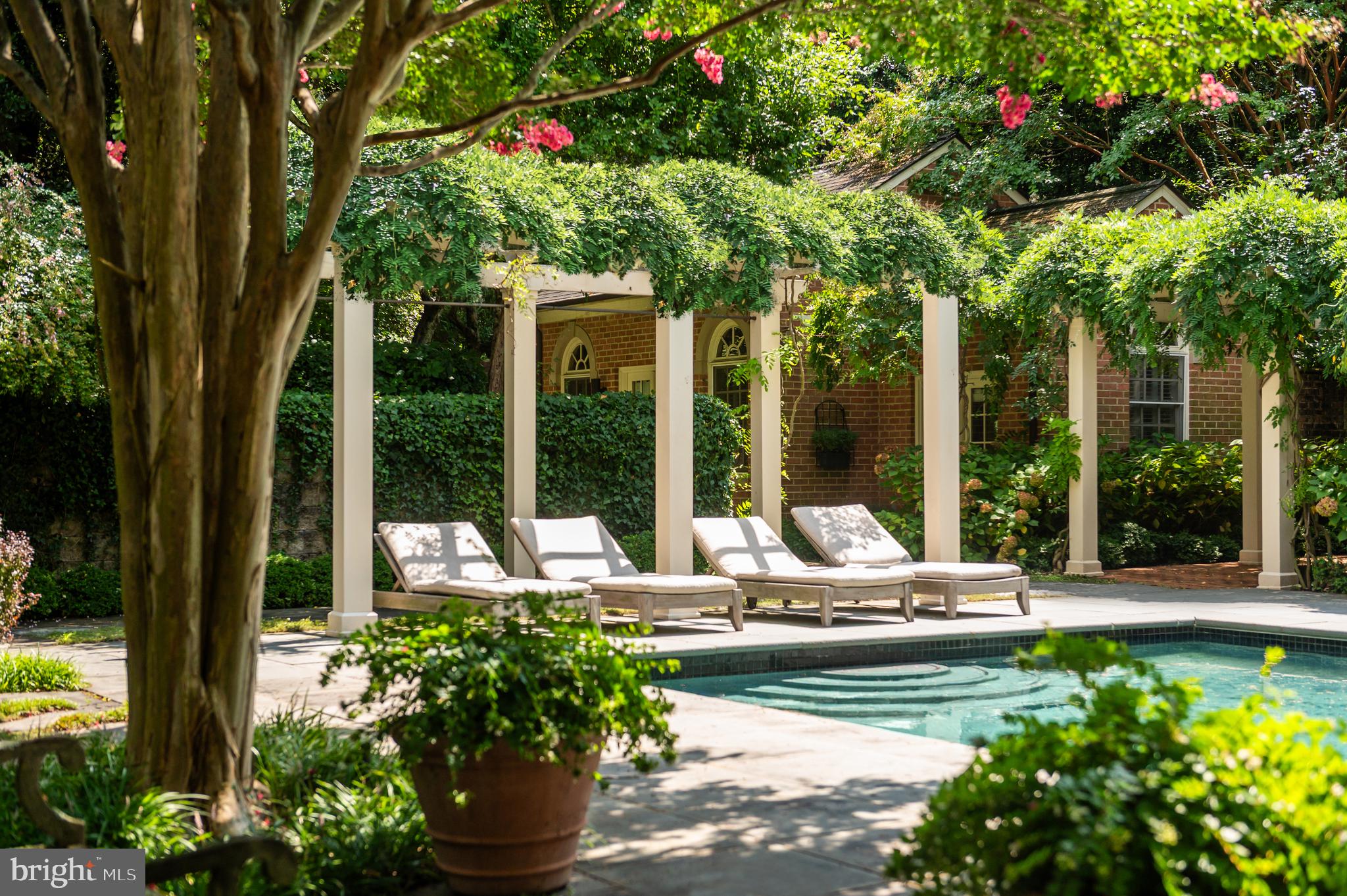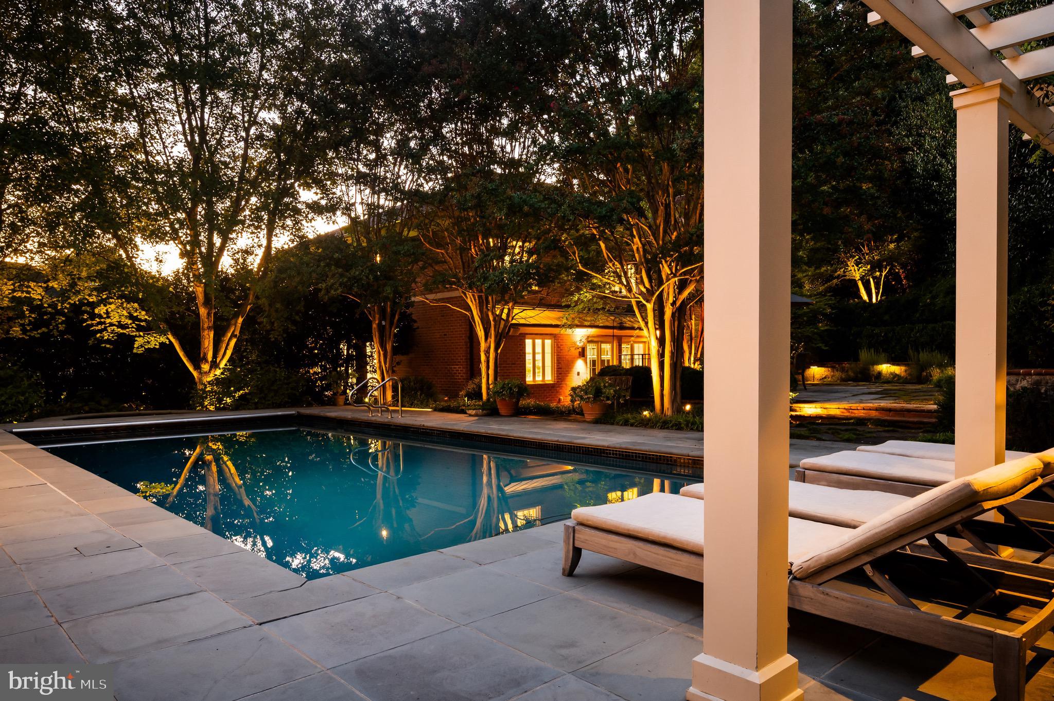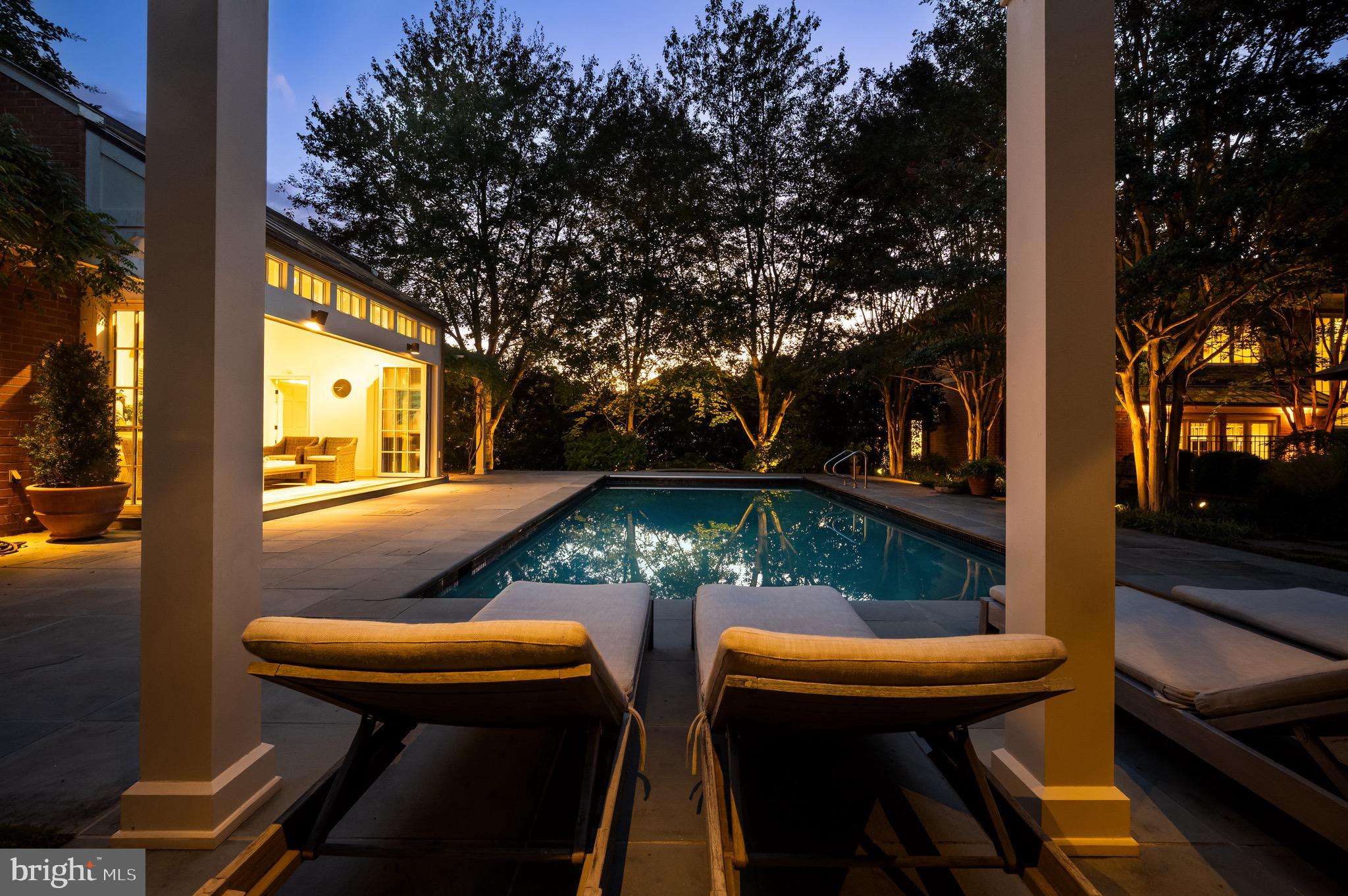 Synonymous with quiet luxury and understated elegance, Kemble Place is one of Washington's most sought-after enclaves. Nestled within this exclusive community, 4814 Kemble Place occupies a rare double lot, (encompassing both 4814 and 4816 Kemble Place) creating an outdoor oasis that includes a pool, pool house and separate studio/guest house and office. The residence is an update on classic architecture, blending timeless principles with modern livability. Its facade nods to the grand estates of the past while incorporating contemporary elements, creating an unmistakable presence. A dramatic, offset entry introduces the home through a transverse limestone gallery, where a formal powder room and coat closet are discreetly tucked away. Natural light pours into the living spaces through elegant casement windows, highlighting substantial millwork and thoughtful architectural detailing. The sweeping custom designed staircase, floating above a dramatic picture window, aligns beautifully with the formal living room. Anchored by an English limestone fireplace and framed by a balcony overlooking the streetscape, it exudes both scale and refinement. Adjacent, the stately dining room flows into a bay-windowed breakfast room with built-in cabinetry, connecting to the kitchen. At the heart of the expansive grounds behind the main residence is a 40' X 20' pool with integrated spa, finished in bluestone and equipped with an automatic cover. The adjacent pool house opens via NanaWall to an al fresco lounge and long wet bar and features a full bath, garden shed and work room. A separate guest house with kitchenette and full bath separated from the pool house by double pergola covered terraces complete the private retreat--one that belies the home's close-in location. Minutes from Georgetown, Downtown, and major commuter routes, 4814 Kemble Place stands as an exemplary residence at the pinnacle of Washington living.
