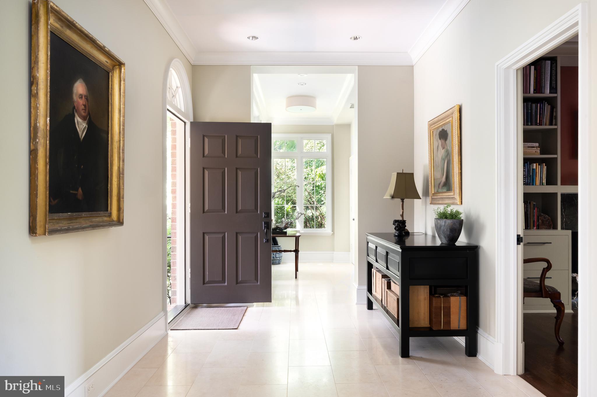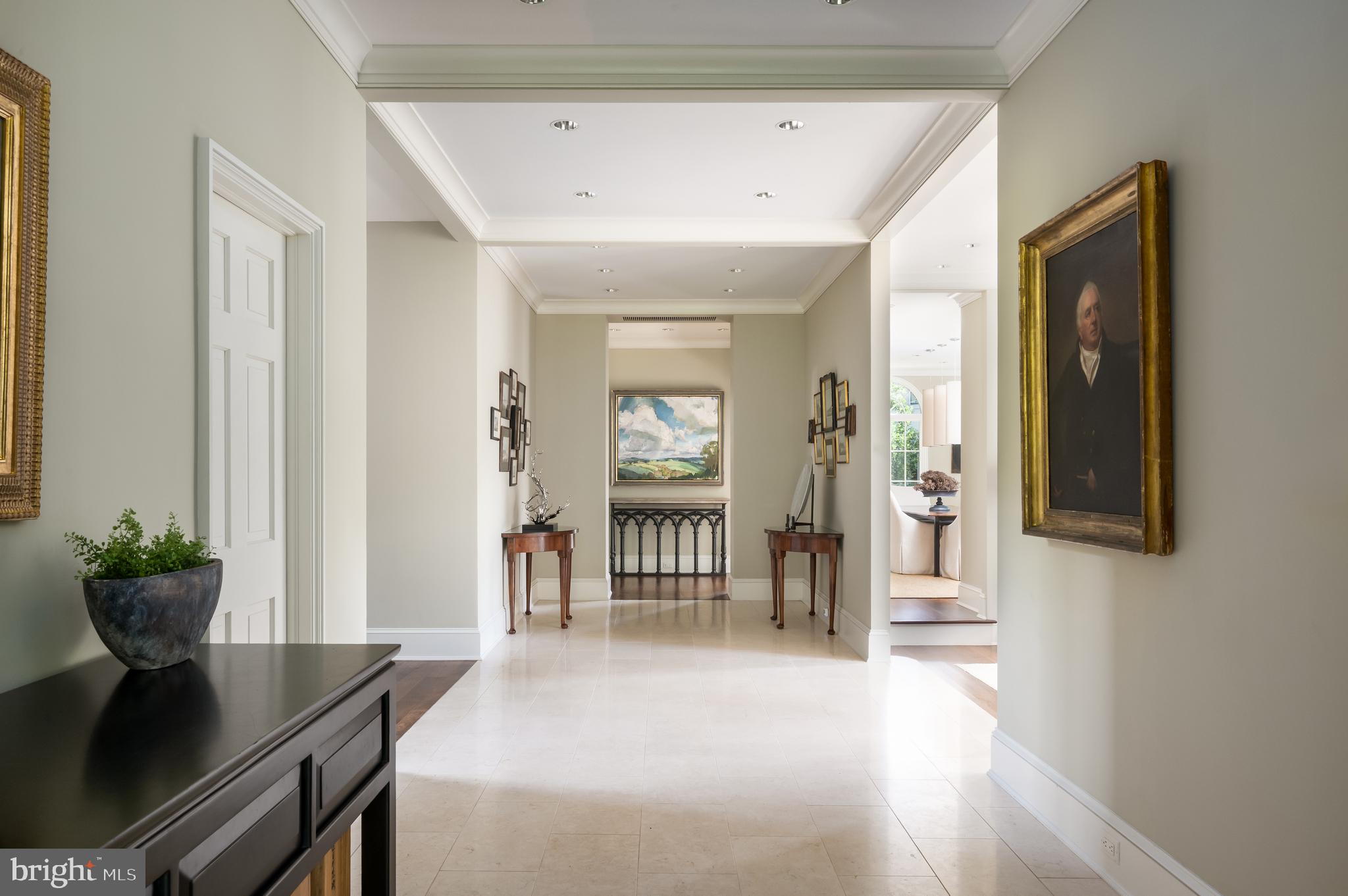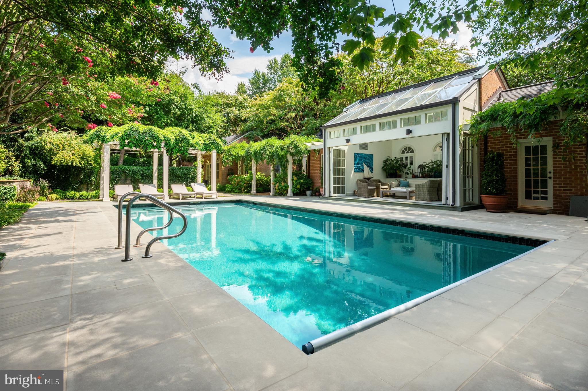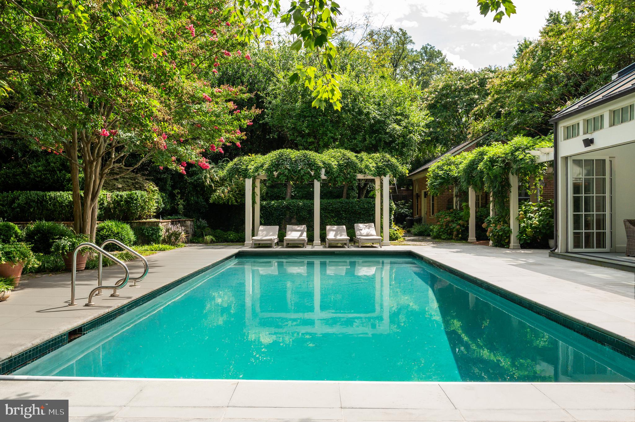 Synonymous with quiet luxury and understated elegance, Kemble Place is one of Washington's most sought-after enclaves. Nestled within this exclusive community, 4814 Kemble Place occupies a rare double lot, (encompassing both 4814 and 4816 Kemble Place) creating an outdoor oasis that includes a pool, pool house and separate studio/guest house and office. The residence is an update on classic architecture, blending timeless principles with modern livability. Its facade nods to the grand estates of the past while incorporating contemporary elements, creating an unmistakable presence. A dramatic, offset entry introduces the home through a transverse limestone gallery, where a formal powder room and coat closet are discreetly tucked away. Natural light pours into the living spaces through elegant casement windows, highlighting substantial millwork and thoughtful architectural detailing. The sweeping custom designed staircase, floating above a dramatic picture window, aligns beautifully with the formal living room. Anchored by an English limestone fireplace and framed by a balcony overlooking the streetscape, it exudes both scale and refinement. Adjacent, the stately dining room flows into a bay-windowed breakfast room with built-in cabinetry, connecting to the kitchen. At the heart of the expansive grounds behind the main residence is a 40' X 20' pool with integrated spa, finished in bluestone and equipped with an automatic cover. The adjacent pool house opens via NanaWall to an al fresco lounge and long wet bar and features a full bath, garden shed and work room. A separate guest house with kitchenette and full bath separated from the pool house by double pergola covered terraces complete the private retreat--one that belies the home's close-in location. Minutes from Georgetown, Downtown, and major commuter routes, 4814 Kemble Place stands as an exemplary residence at the pinnacle of Washington living.