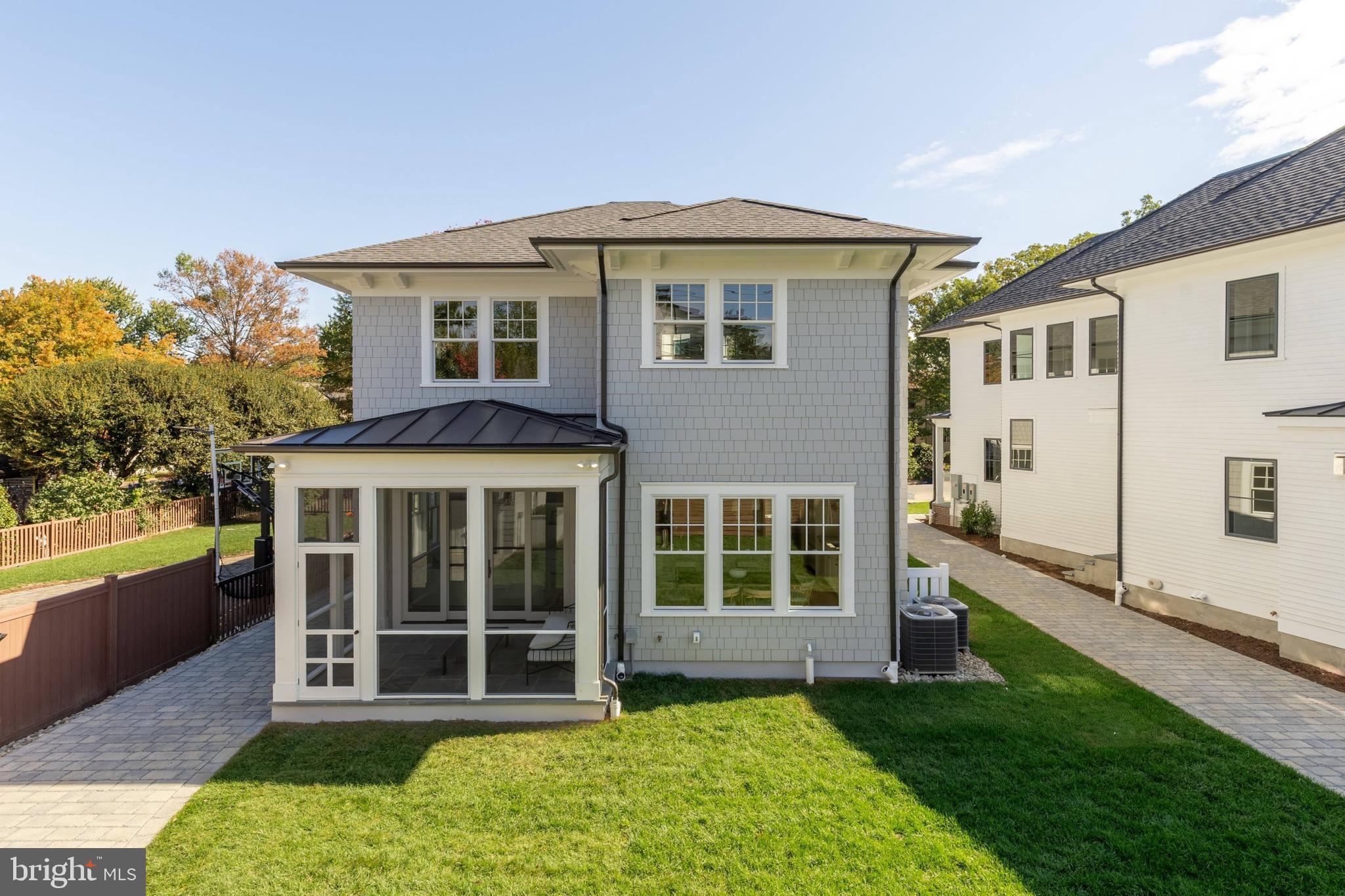 The exterior makes a charming first impression, with gray Hardie shingles, crisp white trim, and dark shutters evoking the quiet luxury of a Nantucket summer cottage. A deep paver driveway along the side leads discreetly to a private detached garage at the rear of the property. The entry, tucked beneath a welcoming portico, opens into a dedicated reception area, with a light-filled den situated just off to one side.