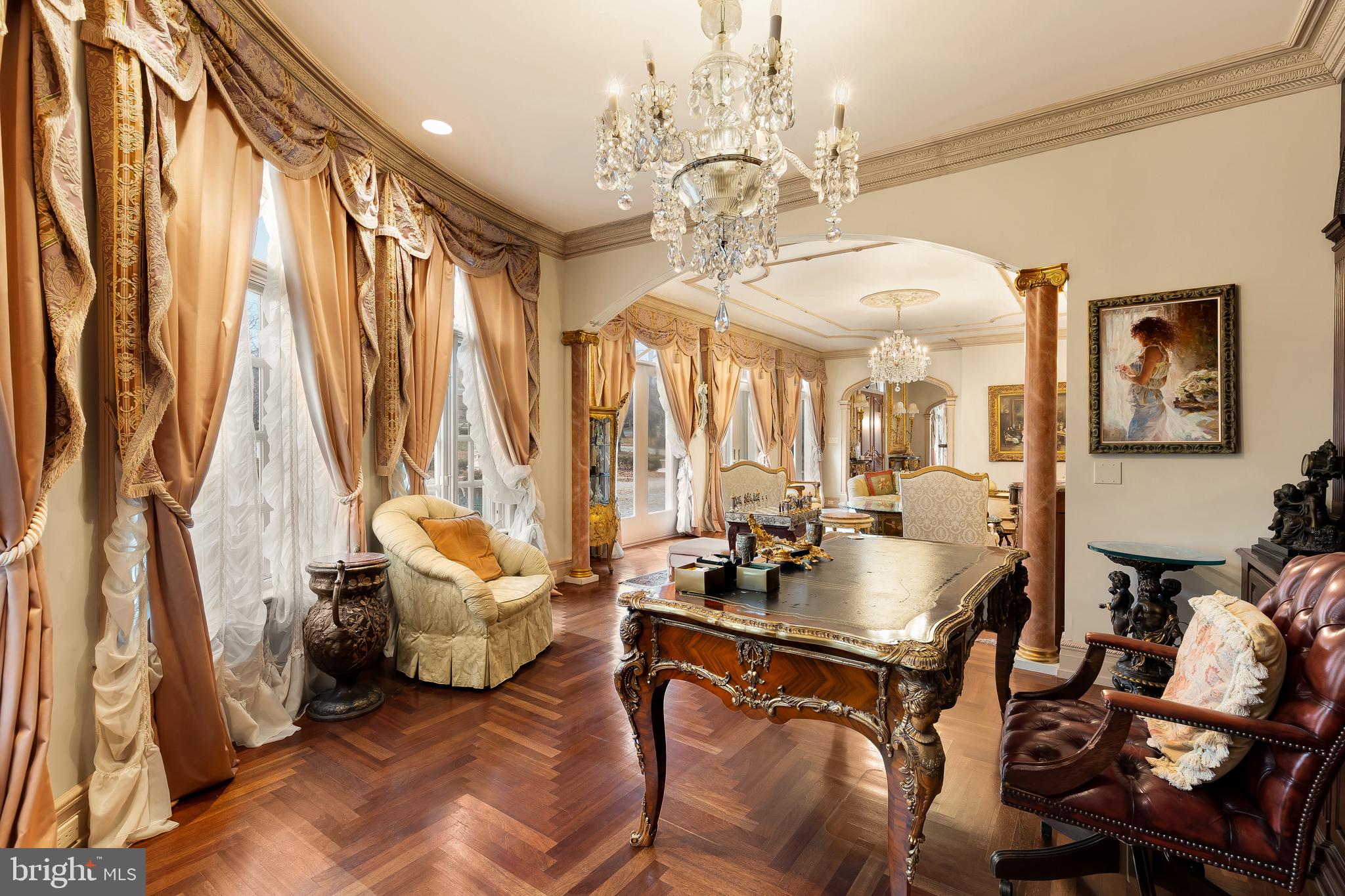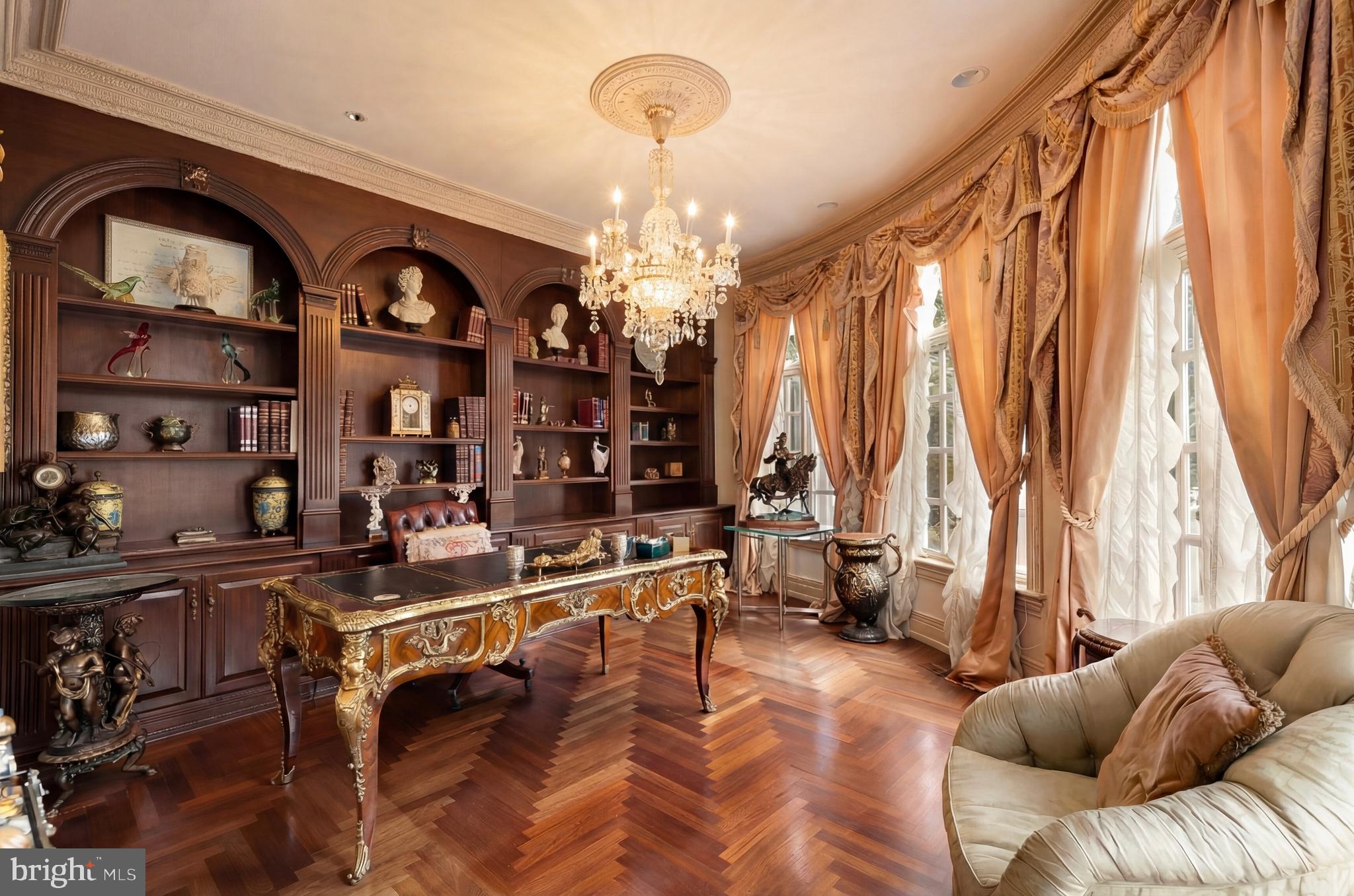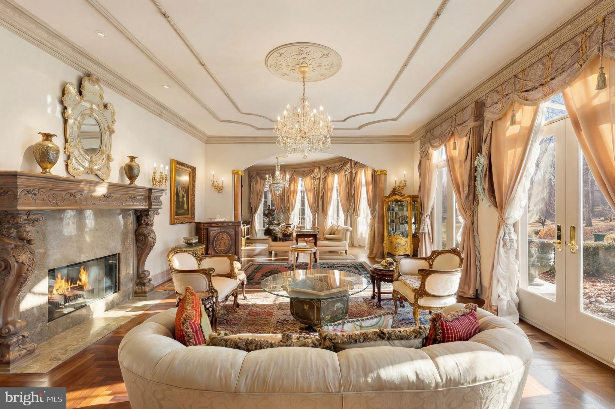 Double doors part to introduce a stunning foyer, framed by sweeping double staircases with a shimmering crystal chandelier overhead and classically inlaid marble floors beneath. An expansive floor plan spans over 17,000 square feet of exquisitely detailed living space. Formal living and dining rooms flank the entryway in a traditional center hall configuration. The former features a fireplace and flows into a dignified study, lined with a curved wall of windows and rich built-ins. Both spaces showcase intricate millwork and parquet flooring.