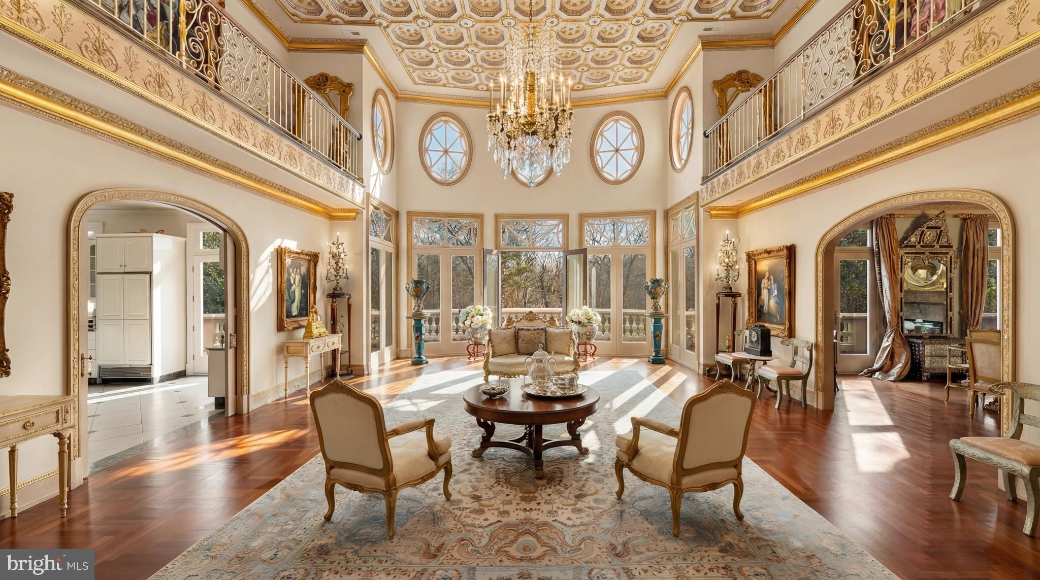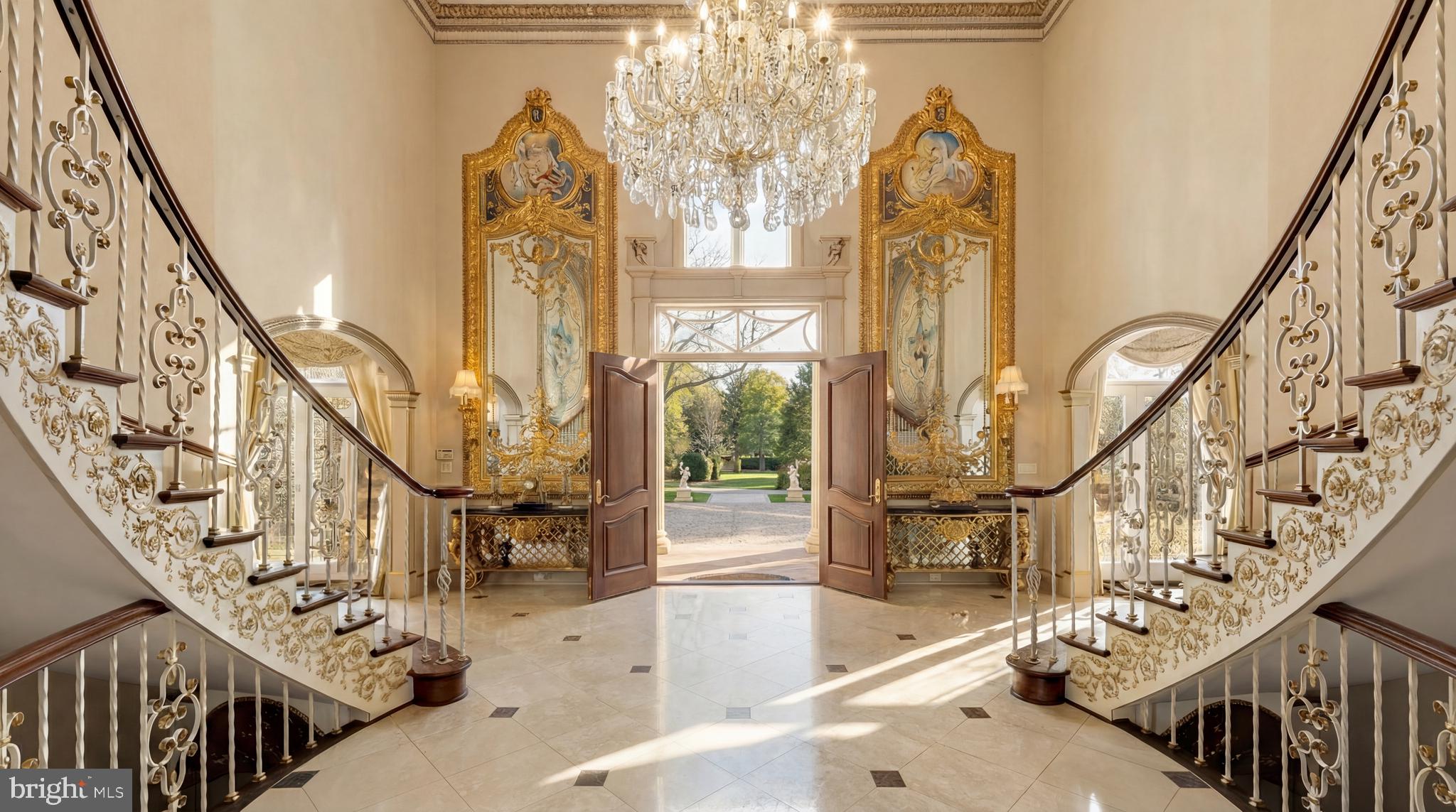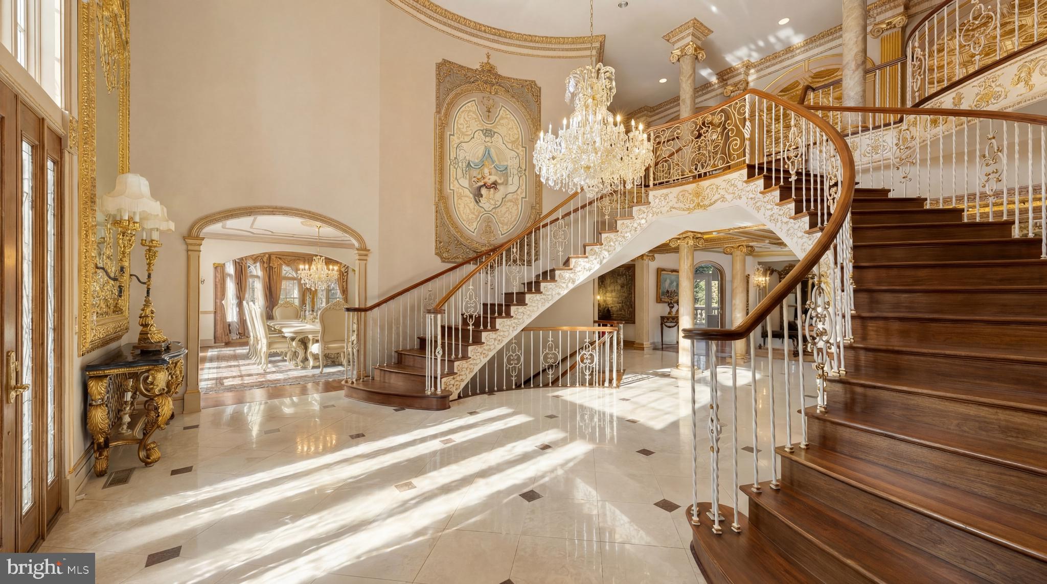Double doors part to introduce a stunning foyer, framed by sweeping double staircases with a shimmering crystal chandelier overhead and classically inlaid marble floors beneath. An expansive floor plan spans over 17,000 square feet of exquisitely detailed living space. Formal living and dining rooms flank the entryway in a traditional center hall configuration. The former features a fireplace and flows into a dignified study, lined with a curved wall of windows and rich built-ins. Both spaces showcase intricate millwork and parquet flooring.