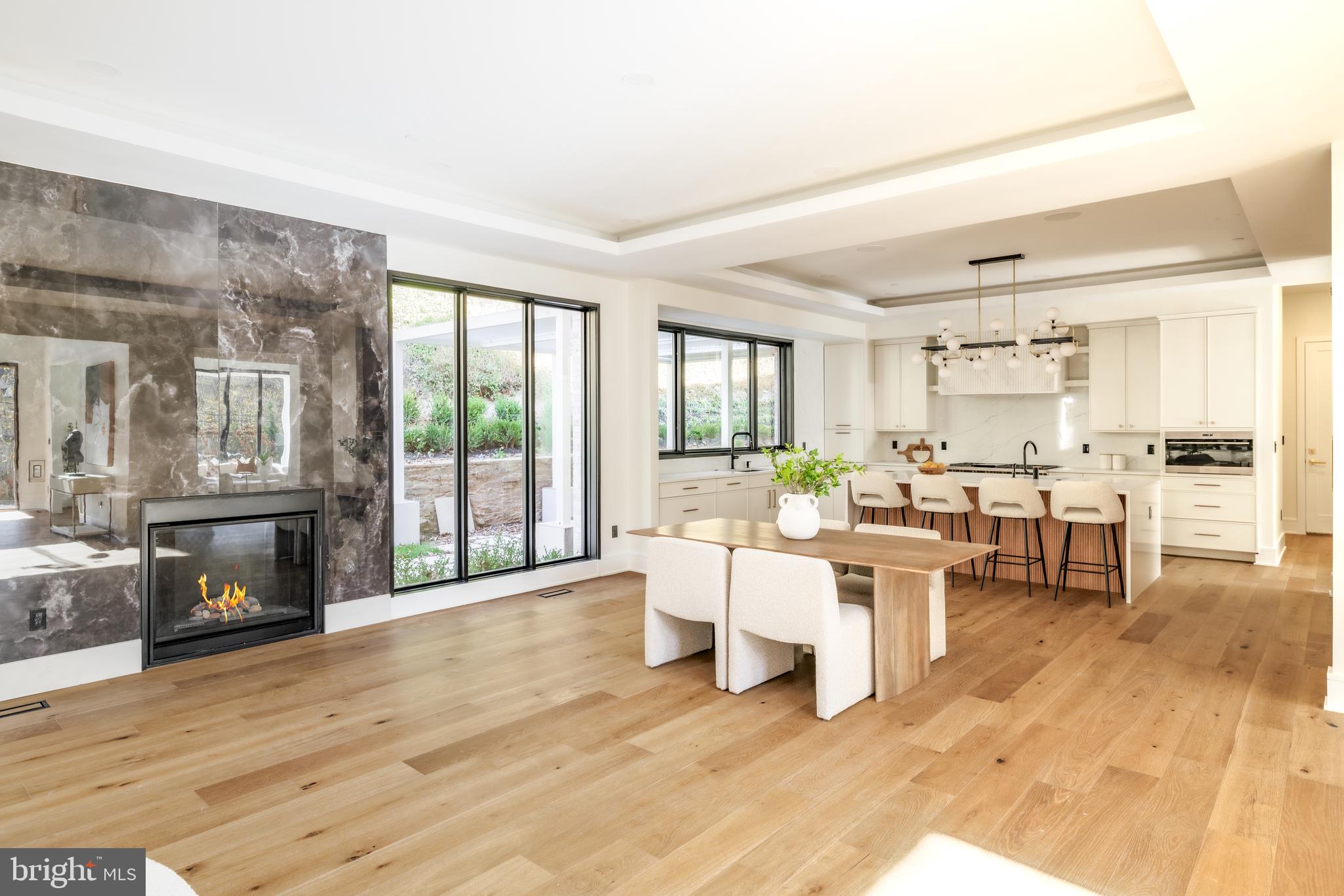 The informal living area centers on a family room anchored by a striking gas fireplace set within a porcelain and marble surround, framed by panoramic views of the rear terrace. Throughout the main level, 7.5-inch white oak floors, Visual Comfort lighting, and Lutron smart controls establish a cohesive atmosphere of sophistication. The entire home is equipped with Bose and Polk sound systems, with a total of 11 speaker pairs providing immersive audio throughout.