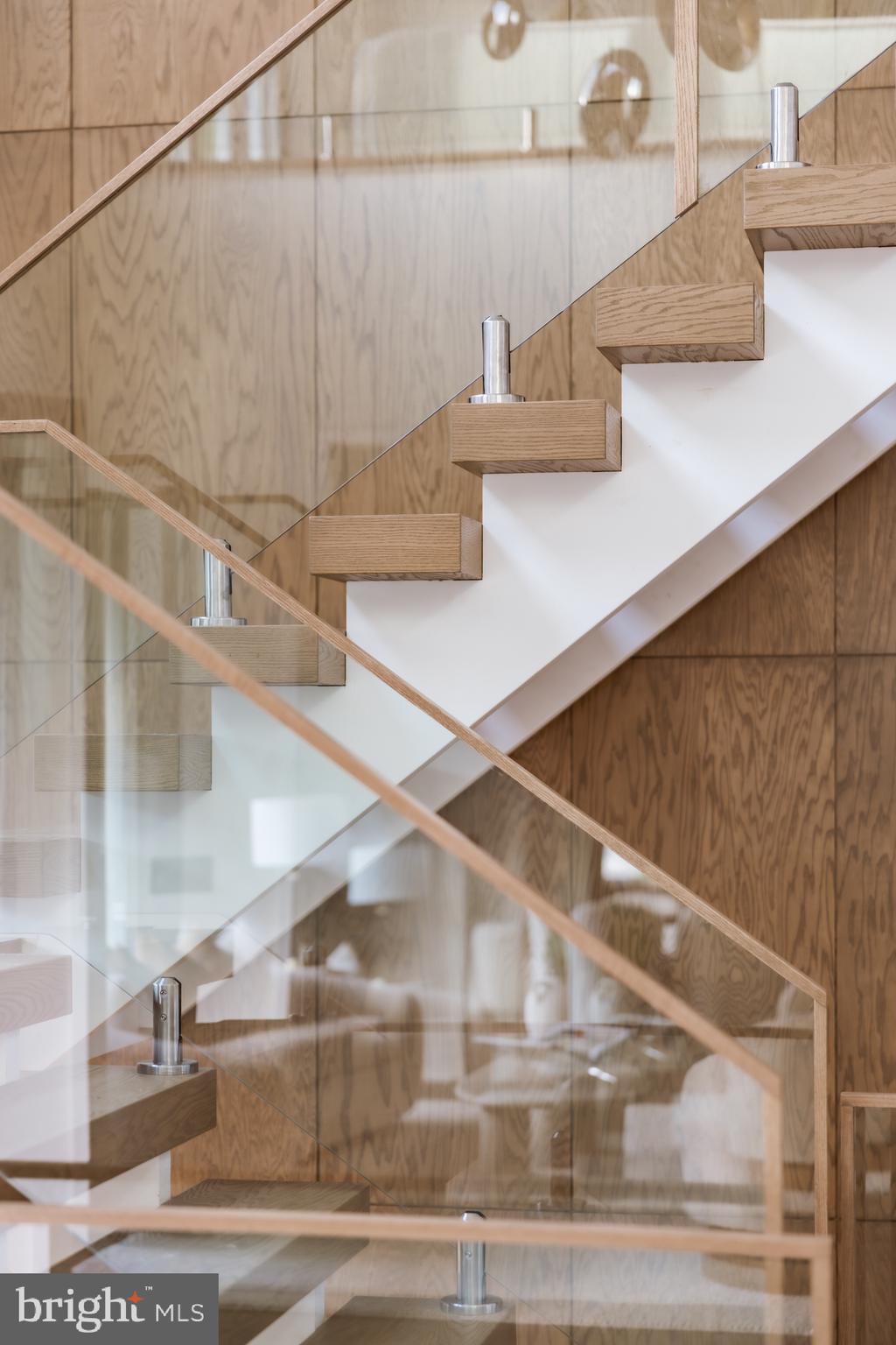 Inside, a floating Viewrail staircase of four-inch treads and glass railings rises before a 21-foot paneled red oak wall, establishing the home’s architectural focal point. Expansive sightlines create a seamless connection between formal and informal spaces throughout the light-filled main level.