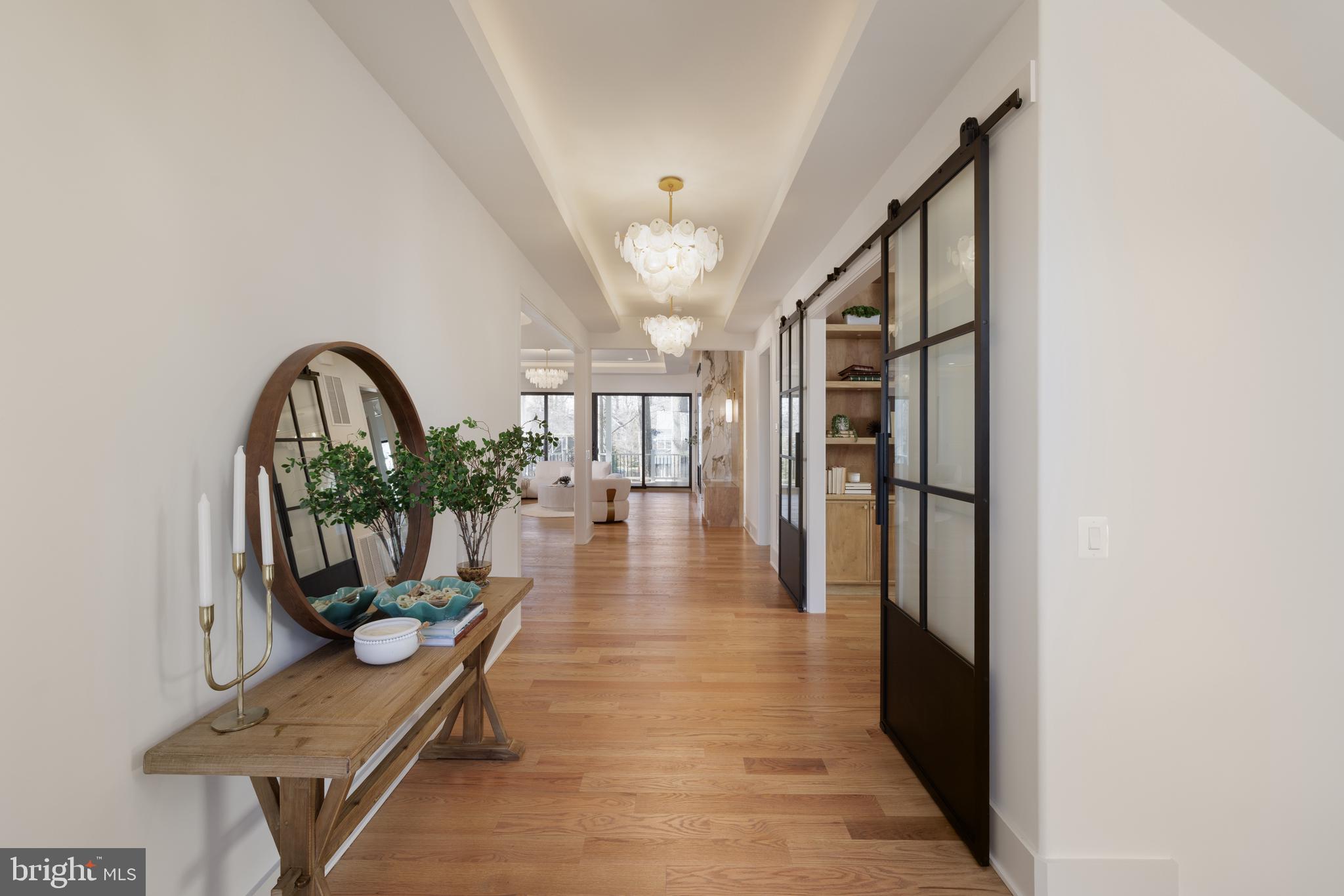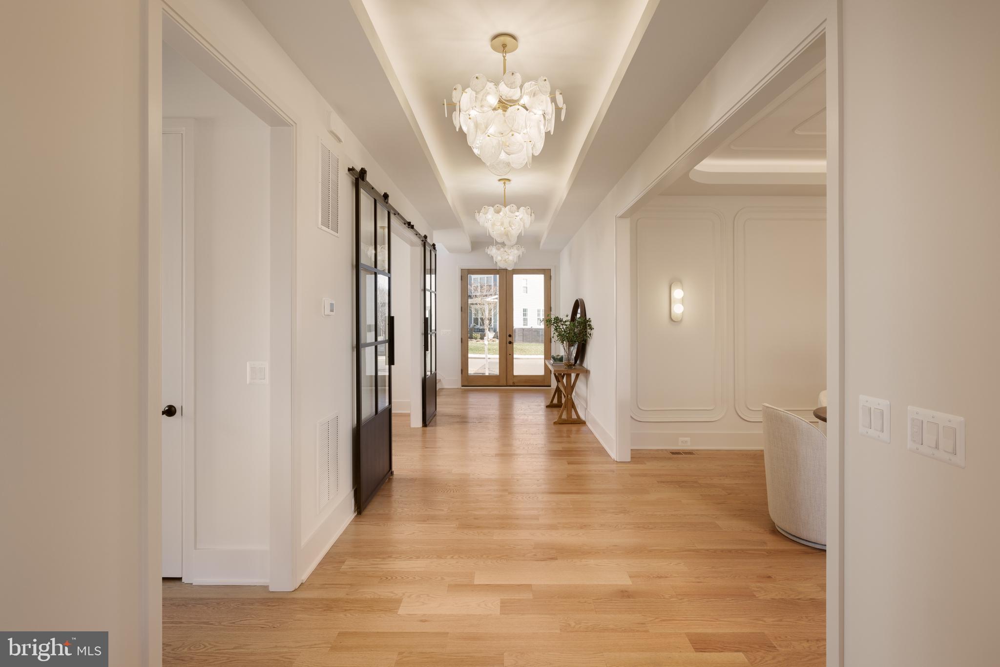 Striking double front doors introduce an elegantly deep foyer defined by a curved tray ceiling with soft indirect illumination, establishing the home's ethos. Wide-plank solid hardwood flooring flows throughout the main level, past sliding gridded glass and metal doors leading into the office with custom built-ins and integrated LED lighting. The formal dining room opposite the foyer showcases craftsmanship with double wall picture frame molding and a matching backlit ceiling cove.