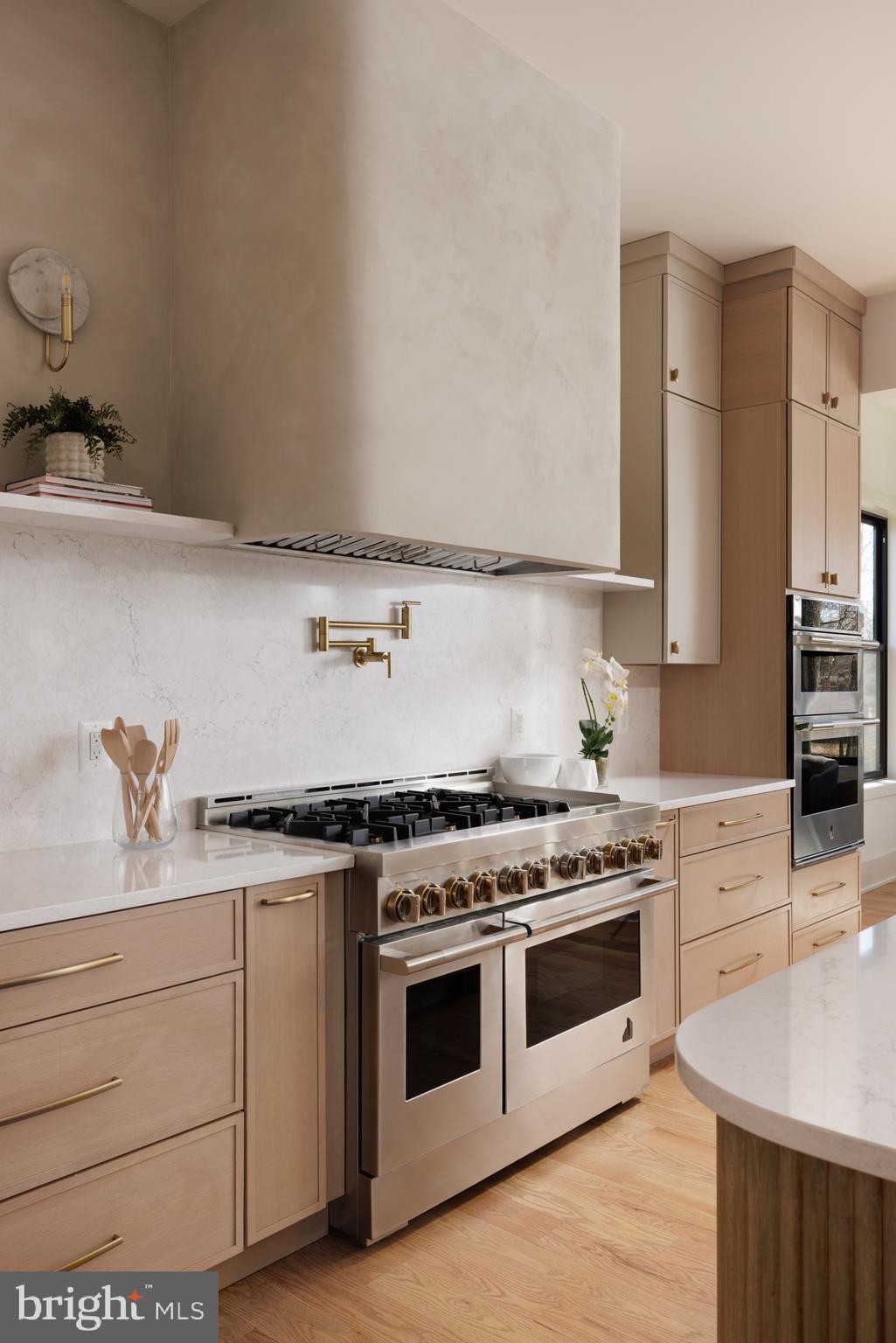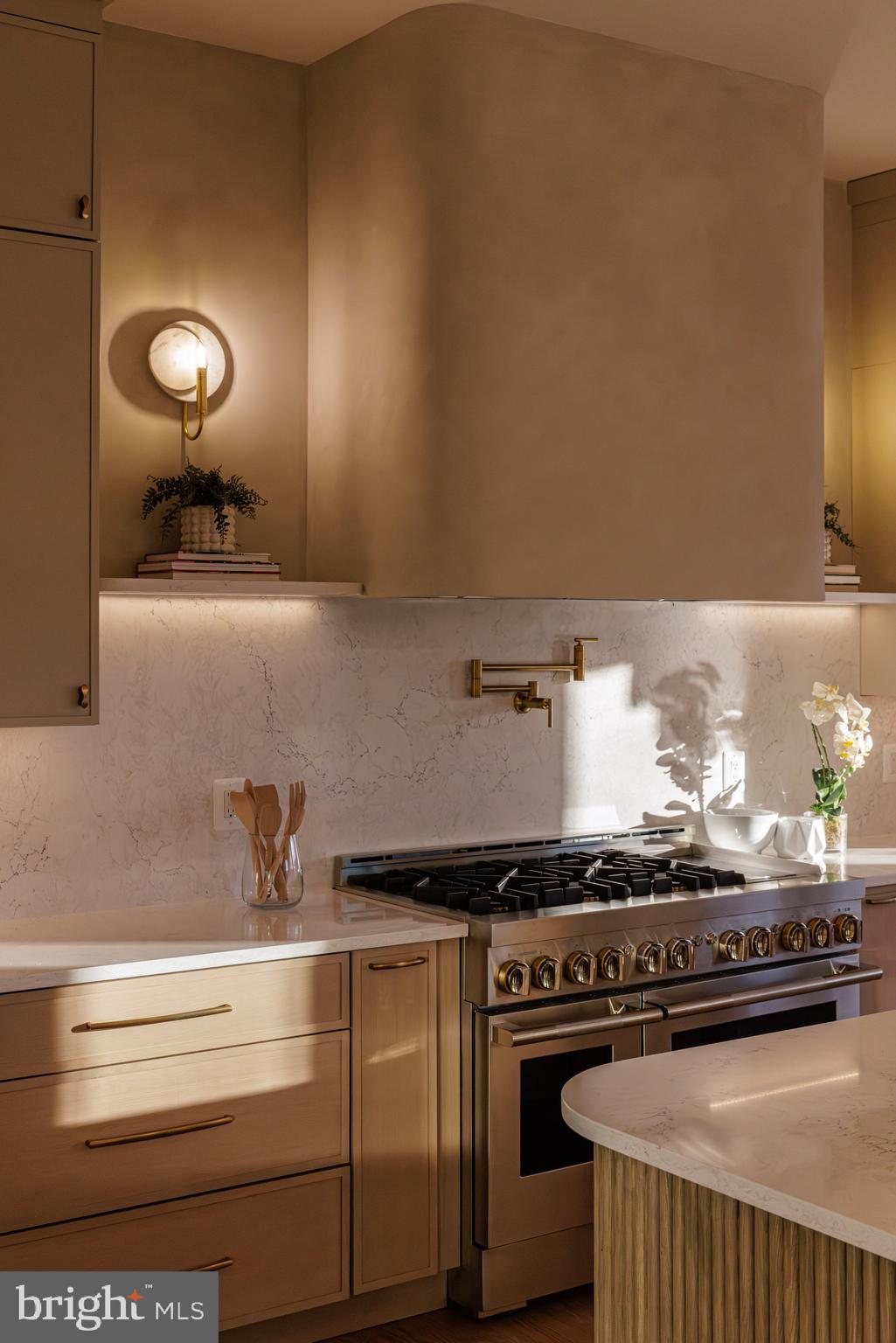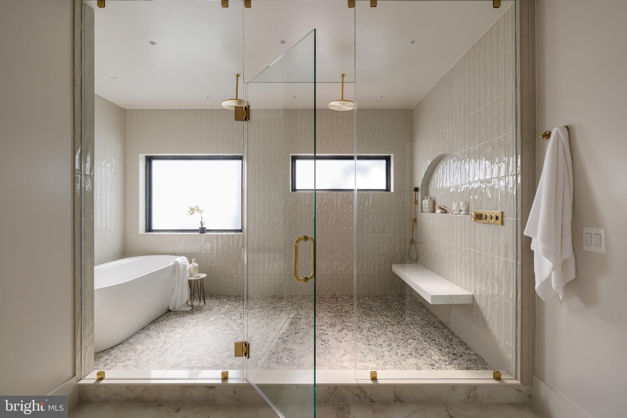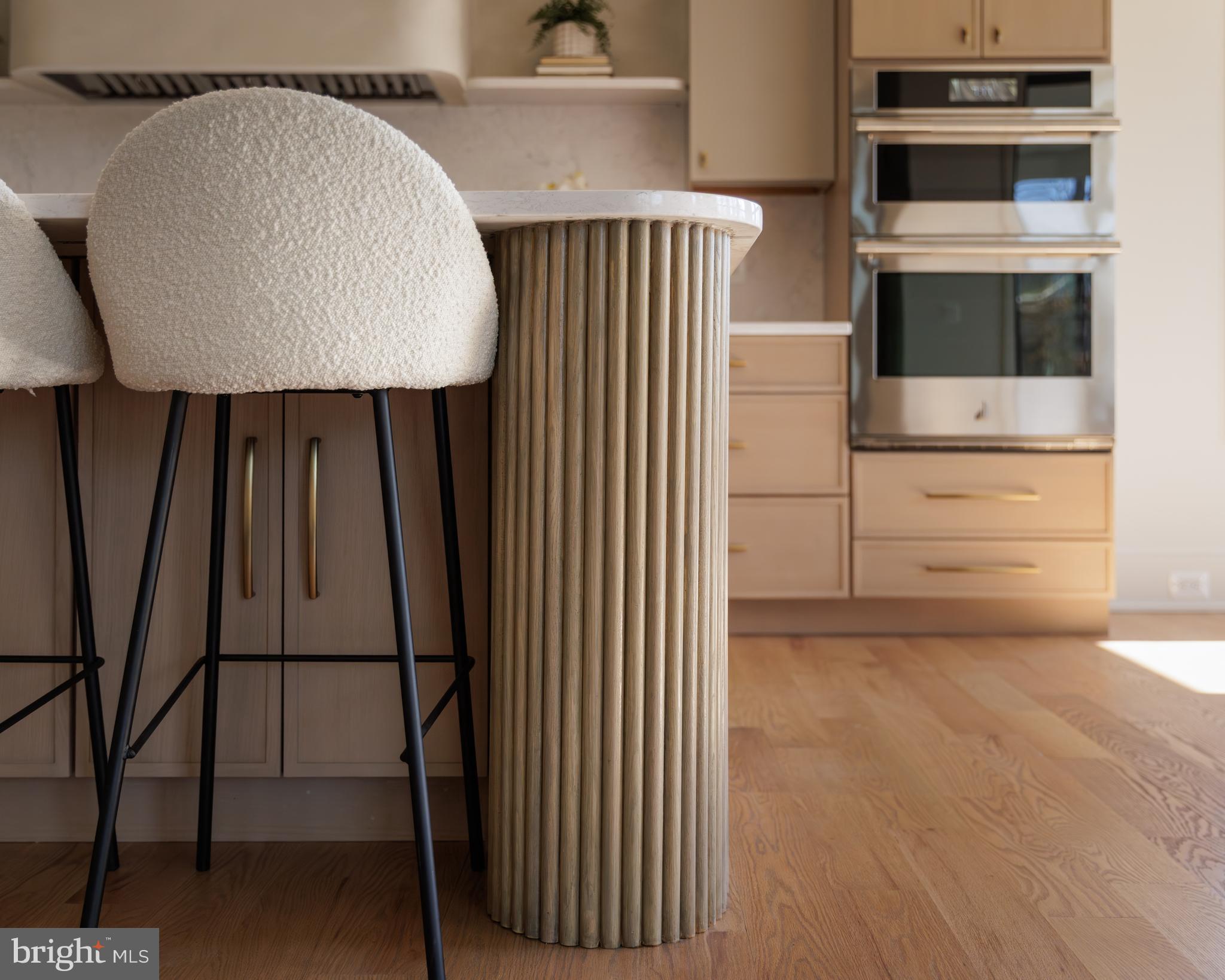 Designed with both form and function in mind, the kitchen showcases custom designer cabinetry, indirect ceiling and toe-kick lighting, and a full professional-grade JennAir appliance configuration. An ample walk-in pantry, oversized island with reeded wood ends, and adjacent breakfast area support casual living, while a well-appointed mudroom with built-in bench and cubbies provides organization and direct access to the two-car garage. A beautifully finished powder room and thoughtfully placed main-level bedroom suite enhance both the guest experience and the home's multigenerational capabilities.