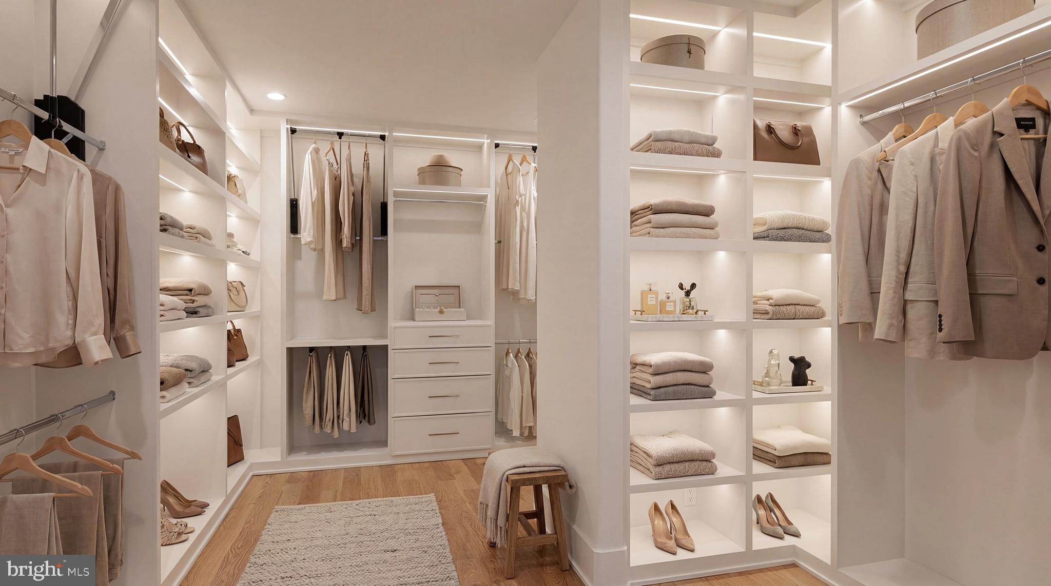 An intimate sitting area is nestled at the top of the grand staircase, from which upper-level spaces branch. The primary suite is the highlight, entered through double doors and defined by an uplit tray ceiling and feature headboard wall. A boutique-like dressing room showcases extensive illuminated built-ins. The spa-like primary bath features a wet room with a Kohler Anthem shower system, separate soaking tub, illuminated niche, double vanity, and private water closet. Three additional bedrooms are generously sized with walk-in closets and ensuite baths, while a well-equipped laundry room completes the upper level.