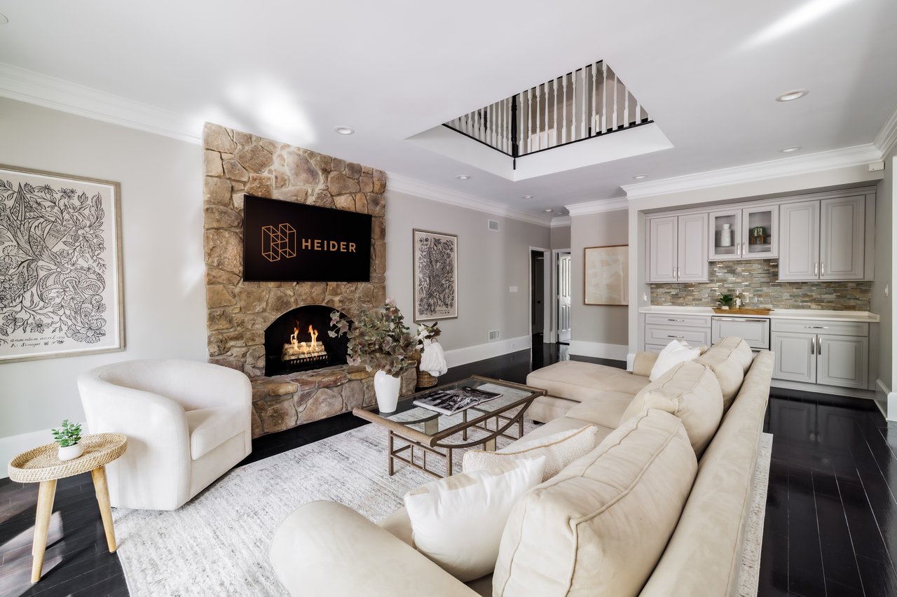A dedicated wet bar with dual wine coolers serves the adjacent family room, which features its own fireplace, outdoor access to the kitchen terrace, and a dramatic opening to the sitting room above.