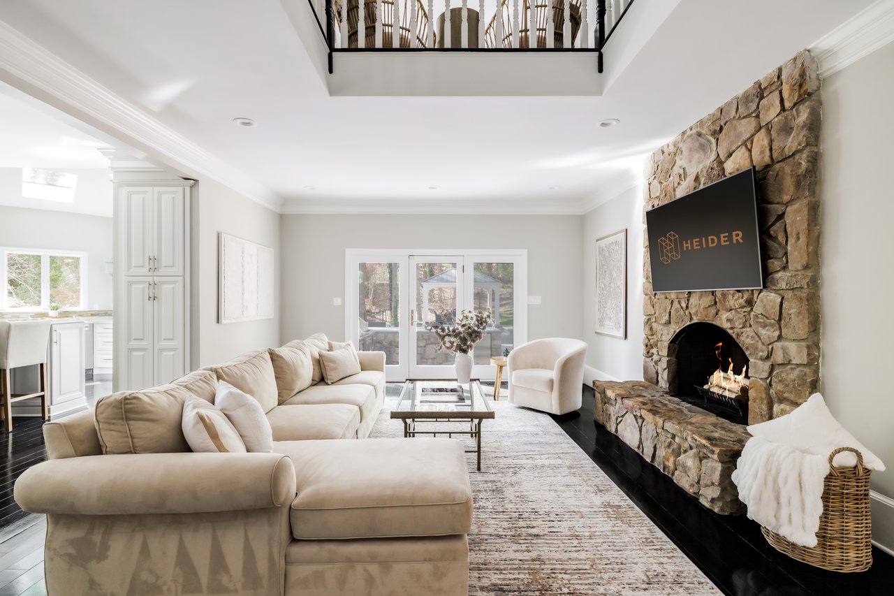 The study exudes a dignified presence with built-in shelving and the flexibility of an ensuite full bath and closet, allowing it to serve as a complete bedroom suite. Across the hall, the formal living room spans embassy scale, with a wood-burning fireplace and oversized windows framing the front lawn. Twin archways lead to the banquet-sized dining room, which connects directly to the showpiece kitchen.