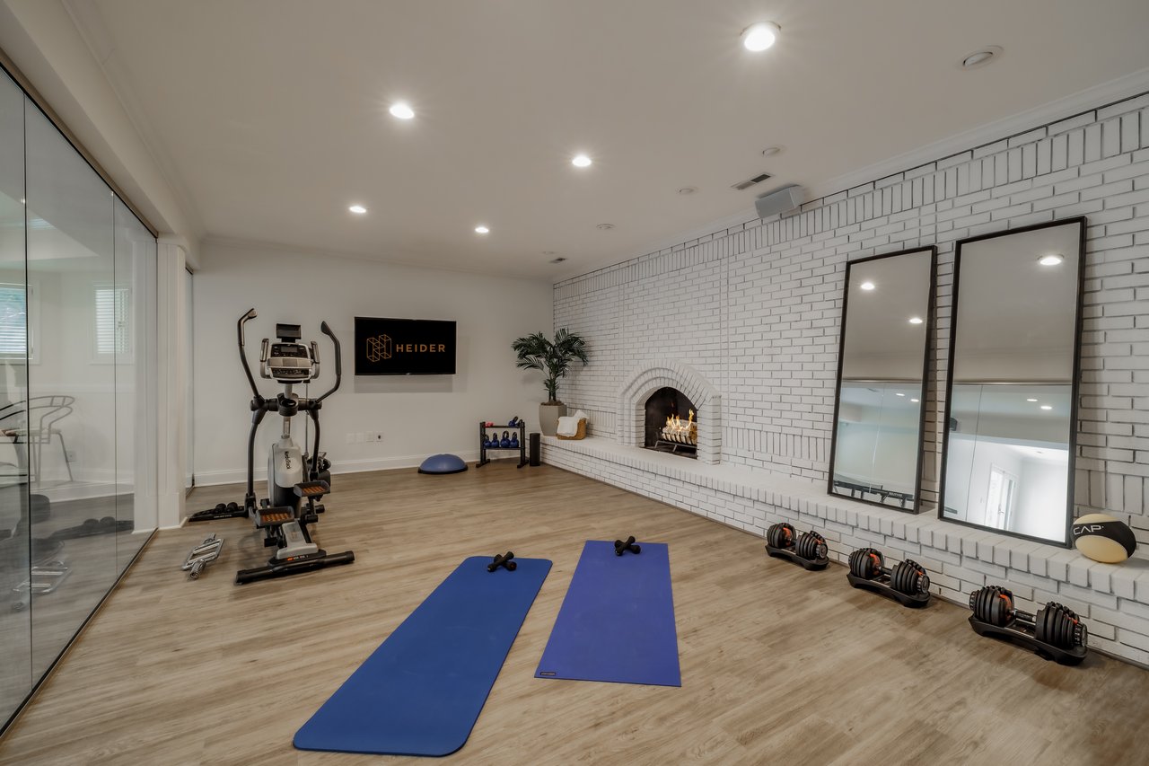 Three secondary bedrooms offer generous proportions, each with walk-in closets and en-suite baths. The top level includes a versatile fifth bedroom or studio space, while the lower level boasts a full kitchenette, fitness center, lounge, and two additional baths.
