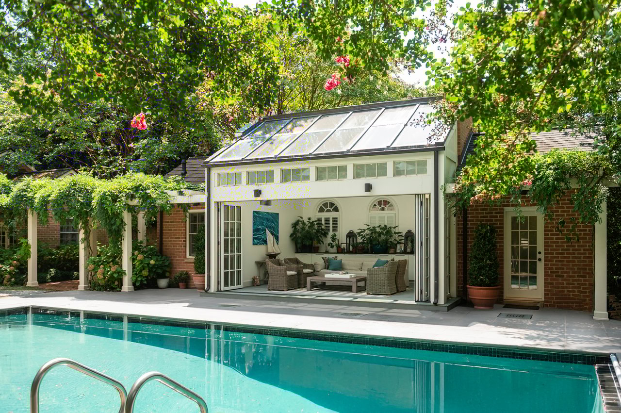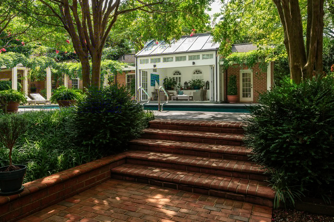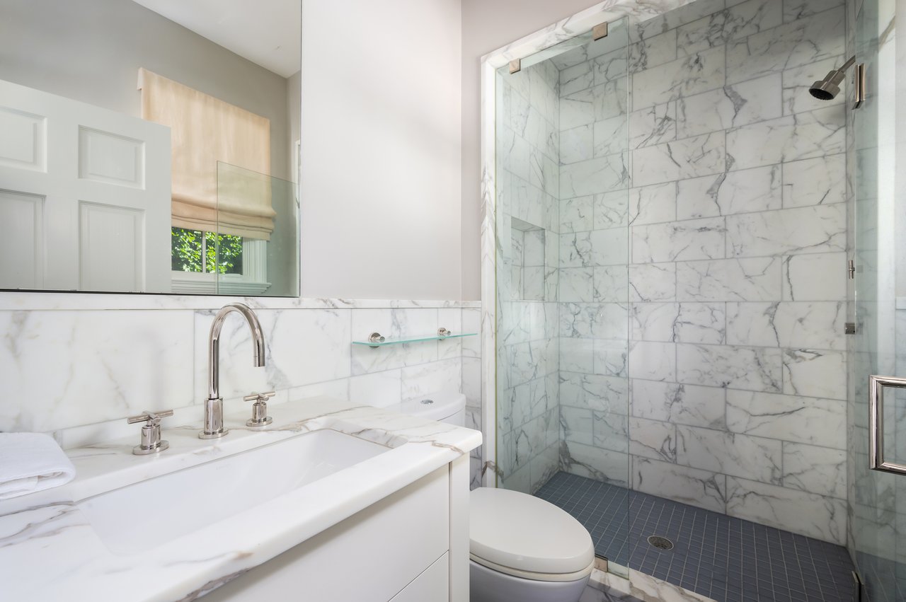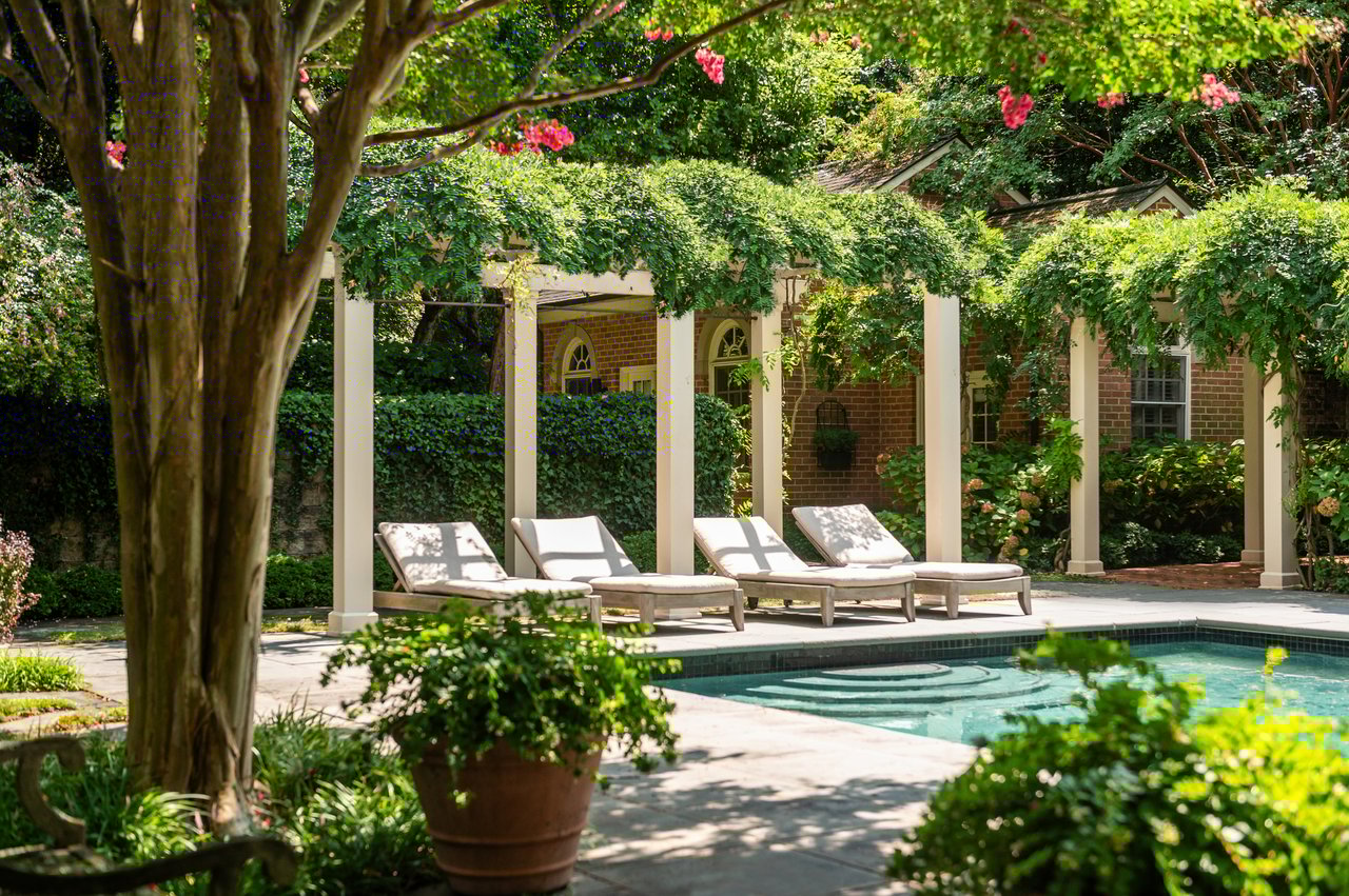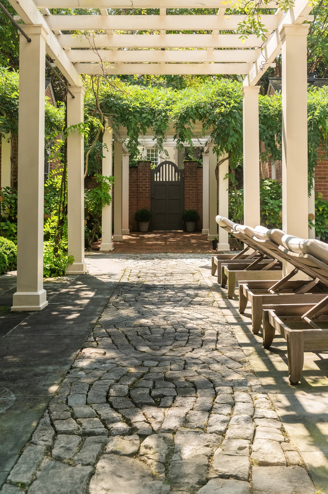 Synonymous with quiet luxury and understated elegance, Kemble Place is one of Washington’s most sought-after enclaves. Nestled within this exclusive community, 4814 Kemble Place occupies a rare double lot shaped by the graceful curve of the street, creating a rare combination of expansive space and privacy. The residence is an update on the classic red brick Colonial, blending timeless architectural principles with modern livability. Its façade nods to the grand estates of the past while incorporating contemporary elements, creating an unmistakable presence. A dramatic, offset entry introduces the home through a transverse limestone gallery, where a formal powder room and coat closet are discreetly tucked away. Natural light pours into the living spaces through elegant casement windows, highlighting substantial millwork and thoughtful architectural detailing. The sweeping custom designed staircase, floating above a dramatic picture window, aligns beautifully with the formal living room. Anchored by an English limestone fireplace and framed by a balcony overlooking the streetscape, it exudes both scale and refinement. Adjacent, the stately dining room flows into a bay-windowed breakfast room with built-in cabinetry, connecting to the kitchen.. The kitchen featuring luxurious marble countertops, a Thermador cooktop capped by an oversized stainless steel hood, integrated panel Sub-Zero refrigerator/freezer and wine storage modules, Miele ovens and dishwasher, SieMatic cabinetry, and a waterfall wooden bar at the back of the center island that creates seating for three. A 35” x 82” slab of veined marble sits behind the cooktop, cut so that the end pieces slide into the woodwork to reveal sets of lighted shelves. The kitchen is fully open to the adjacent family room, its wall of shelving and framed 65” TV niche infusing warmth and practicality into the space while two sets of French doors open onto the rear terrace. A private library/office with custom cabinetry and lighting and a wood-burning fireplace framed with Port Laurent marble complete the main level. The second floor is reached via a staircase with a pair of 11’ windows at the midway landing that affords the view of a specimen Japanese Maple tree. The staircase features a three-story hand-carved serpentine handrail that connects all floors of the house. At the second floor, a landing is illuminated by a skylight set in a vaulted ceiling lit by cove lighting. The capacious upper-level primary suite is accessed through an intimate vestibule, revealing a 25-foot, airy bedroom anchored on one end by a wood-burning fireplace. A stunning dressing room, whose perimeter is lined with custom closets, drawers, and a formal dressing table, serves as the transition into the primary bath. The marble-clad bath features a private nook for the oversized soaking tub, along with dual vanities, walk-in steam shower, and separate water closet. Three additional bedrooms branch off of the upper-level hallway, which is lit by three vaulted skylights. Each bedroom features ample storage space and an ensuite marble bath. A union of function and entertainment is found in the lower level. A 28-foot multi-purpose room, currently serving as an exercise suite, serves as the level’s main living area, while a professional temperature-controlled wine cellar with a capacity of almost 500 bottles plus shelving for cases is nearby. A dedicated laundry room, two separate storage rooms, a full bath, and access to the two-car garage complete the picture. A private resort, the home’s outdoor space is characterized by a seamless blend of manicured landscaping and extensive hardscaping. A raised patio overlooks mature trees and boxwood hedges that combine with rough retaining walls to create a verdant oasis. At the heart of the expansive grounds behind the main residence is a 40’ X 20’ pool with integrated spa, finished in bluestone and equipped with an automatic cover. The adjacent pool house opens via NanaWall to an al fresco lounge and long wet bar and features a full bath, garden shed and work room. A separate guest house with kitchenette and full bath separated from the pool house by double pergola covered terraces complete the private retreat—one that belies the home’s close-in location. Minutes from Georgetown, Downtown, and major commuter routes, 4814 Kemble Place stands as an exemplary residence at the pinnacle of Washington living.