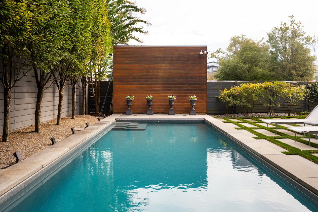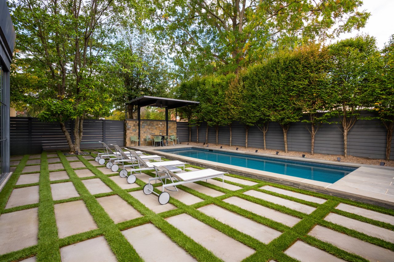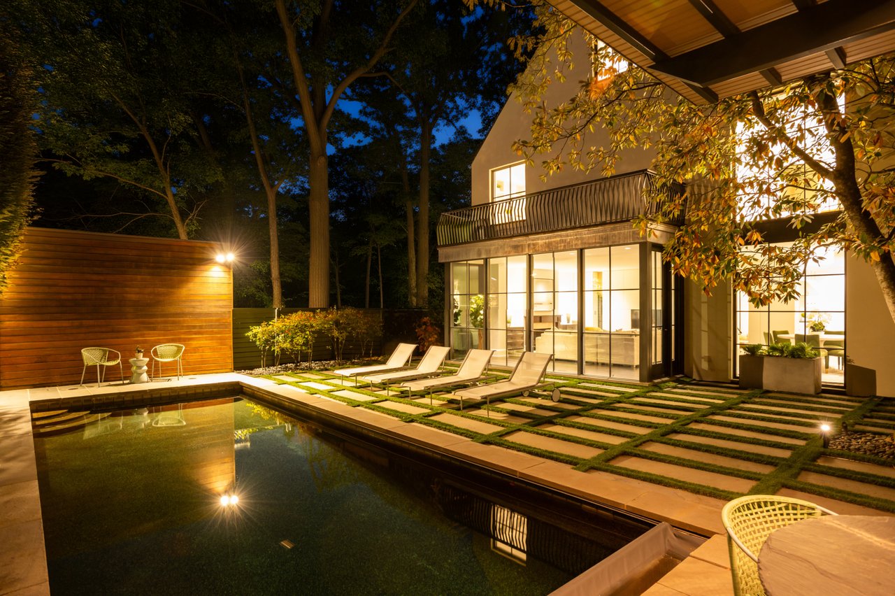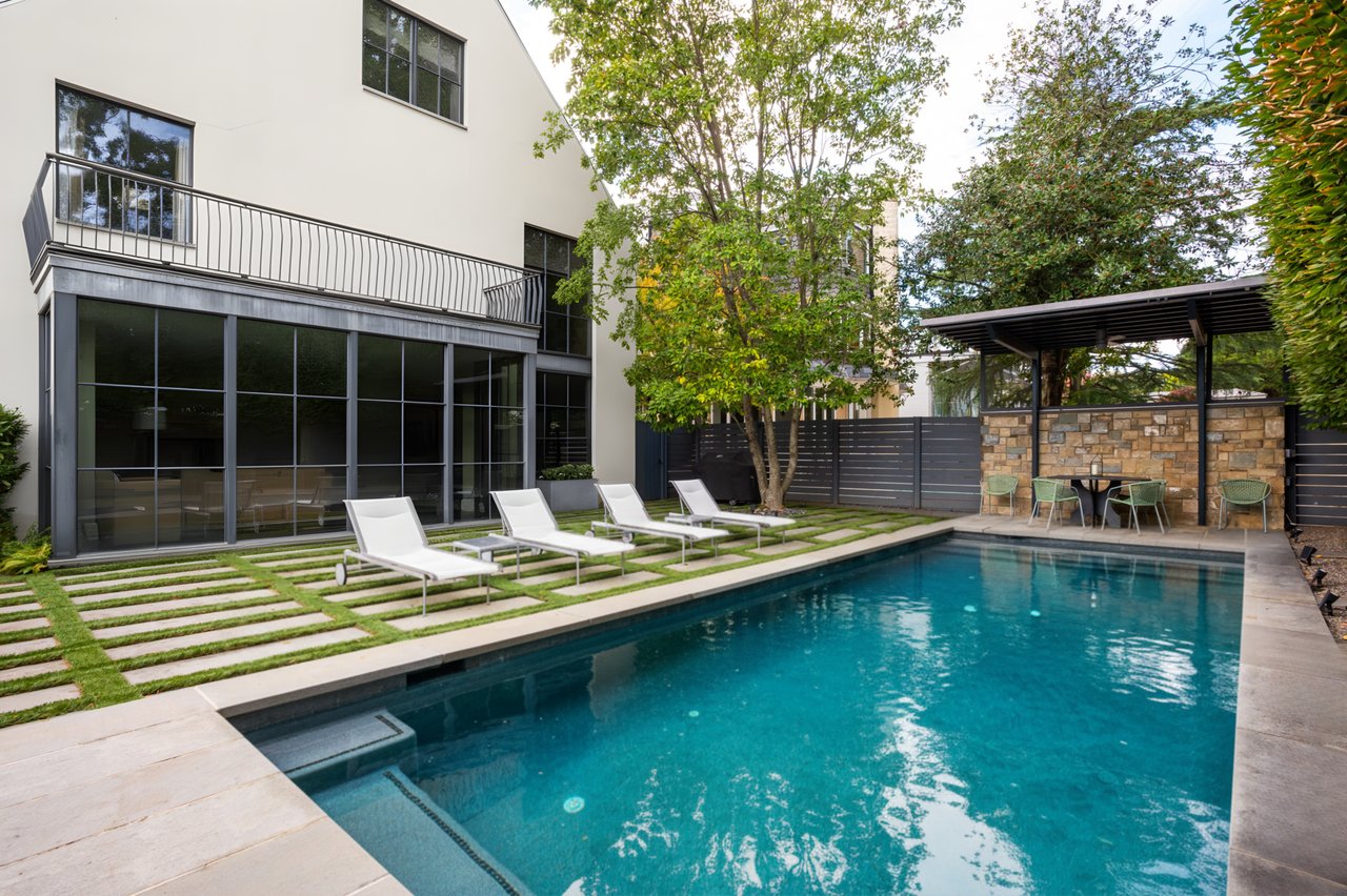Ascending to the top of the sky-lit stairs reveals two more generous bedrooms and a shared, fully-tiled bath with marble vanity. The lower level recreation room is equipped with a series of in-ceiling Sonos speakers and can be effectively utilized as a professional media room. Additionally on the lower level is a fully self-sufficient guest suite complete with kitchenette and full bath. A minimalist haven, the rear outdoor space revolves around a spectacular lap pool equipped with an automatic retractable cover, set against a linear fence and row of uplit trees. The patio consists of stone slabs with an interwoven turf grid in the quintessential Southern California style. A covered al fresco dining area greatly enhances outdoor entertaining utility, and the entire area is basked in warm ambient lighting after the sun sets. The home’s location is one nearly without peers, walkable to Claudio’s Table and Et Voila, as well as mere minutes to Virginia via Chain Bridge and Canal Road. A truly rare blend of curated interior spaces and uncompromising outdoor space, Potomac Avenue NW is undoubtedly one of Washington's hidden gems.