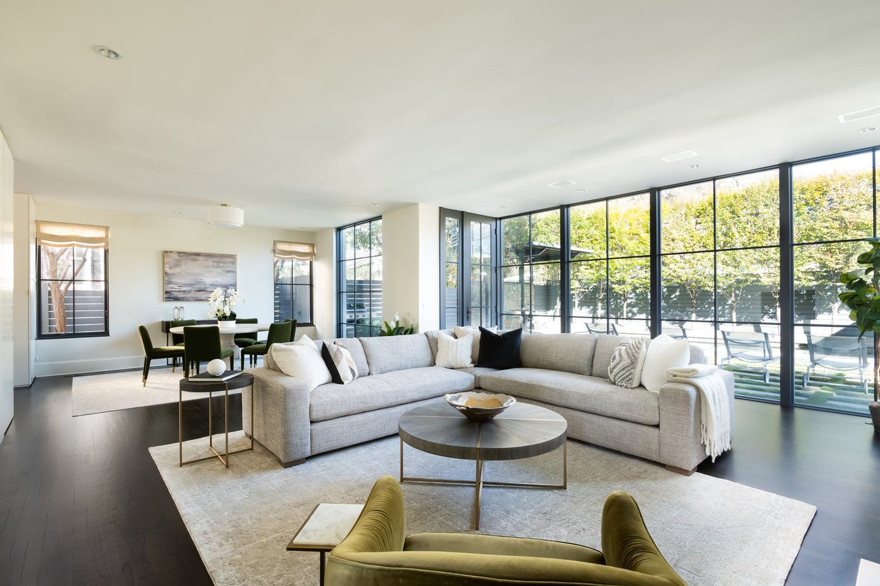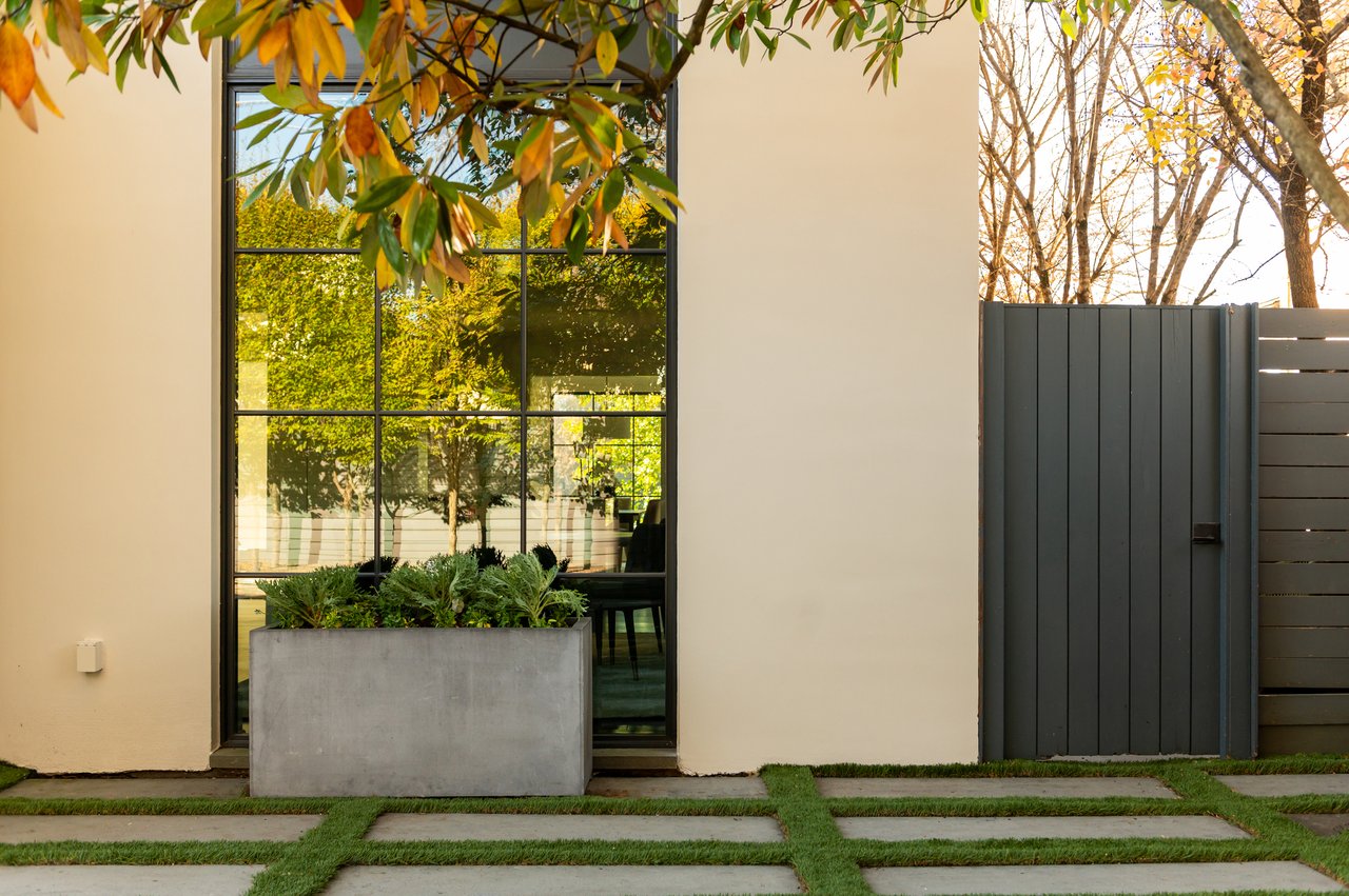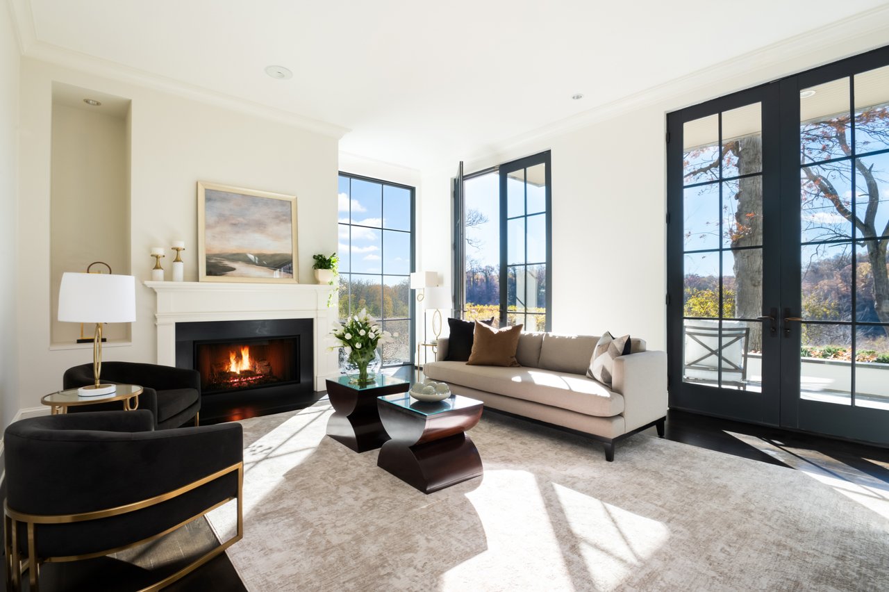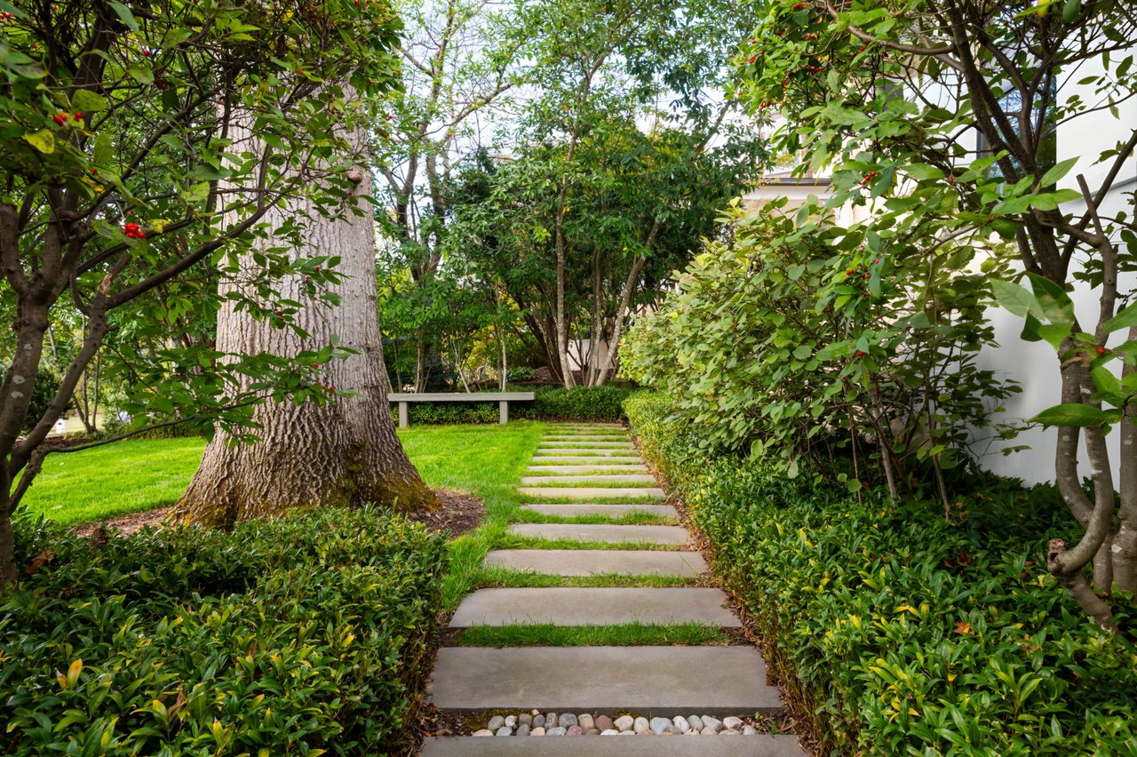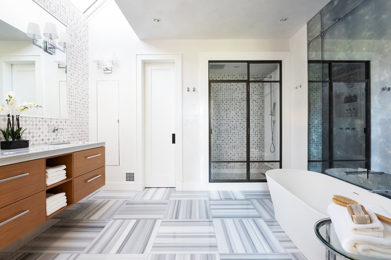 Envisioned in a distinct transitional style, the home’s simple stucco exterior is introduced by a geometric facade punctuated by unbroken, minimalist panes of glass. A private, zen-like front garden sits beneath a lush canopy and combines with a low-walled flagstone patio to create a sanctuary from which to take in the views. An ethereal black and white color palette carries through the light-filled, deceptively large interiors. Rich, dark stained hardwood floors complement dark framing on floor-to-ceiling windows and doors, with handsome millwork and accent lighting throughout. Two sets of French doors in the formal living room open onto the front patio, blurring the lines between indoor and outdoor living. A roaring fireplace and illuminated art niche add warmth and depth. A true functional work of art, the chef’s kitchen features frameless stacked cabinetry, glass-fronted and illuminated on the upper tier, accentuated by stunning brushed brass hardware and concealing ingenious storage solutions behind the unbroken marble slab backsplash. A comprehensive suite of state-of-the-art Wolf and SubZero appliances offers the ultimate in culinary gadgetry. An unbroken gridded wall of glass lines the main level’s substantial informal areas, comprising a generously proportioned family room and casual dining area. A private fireplace infuses coziness into the upper-level primary bedroom, which opens onto a private balcony with sweeping views from two sets of French doors. The dressing room contains extensive built-ins all neatly concealed by full-height doors, framing a large picture window. A blend of contemporary elements with classic materials and workmanship, the primary bath is clad in bold marble tile with an intricate mosaic wall behind the floating double vanity. The freestanding tub sits against a smoked mirror backdrop, and the walk-in shower is enclosed by a gridded glass door. Two additional bedrooms on the upper level are both luxuriously appointed, with one featuring a roaring fireplace and both sharing a bold bathroom. A convenient laundry room completes the level.