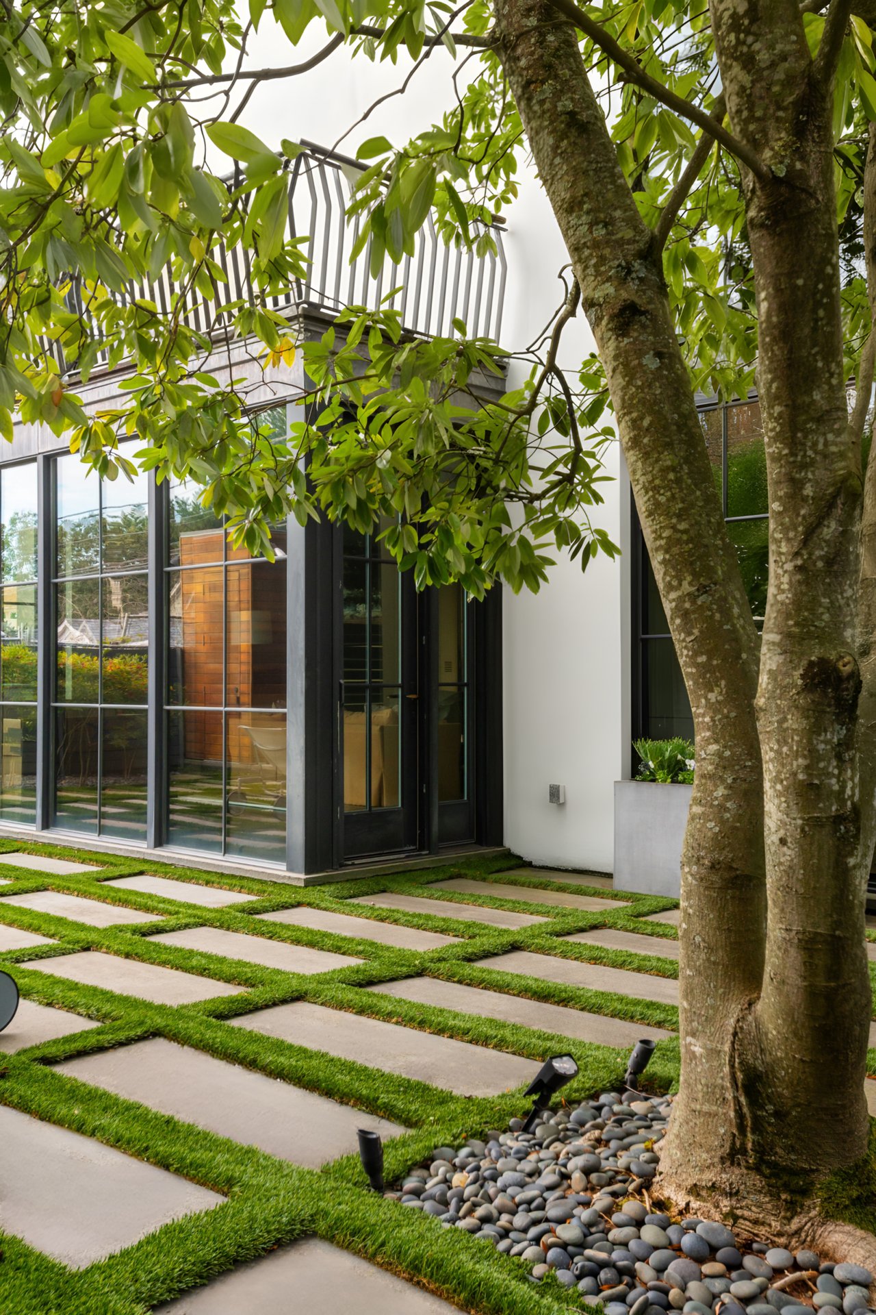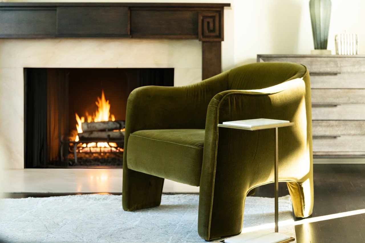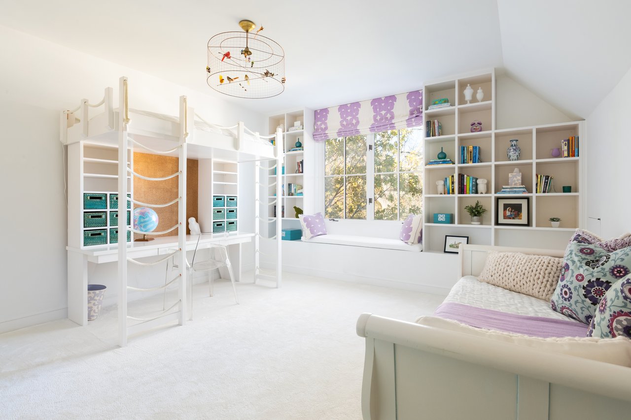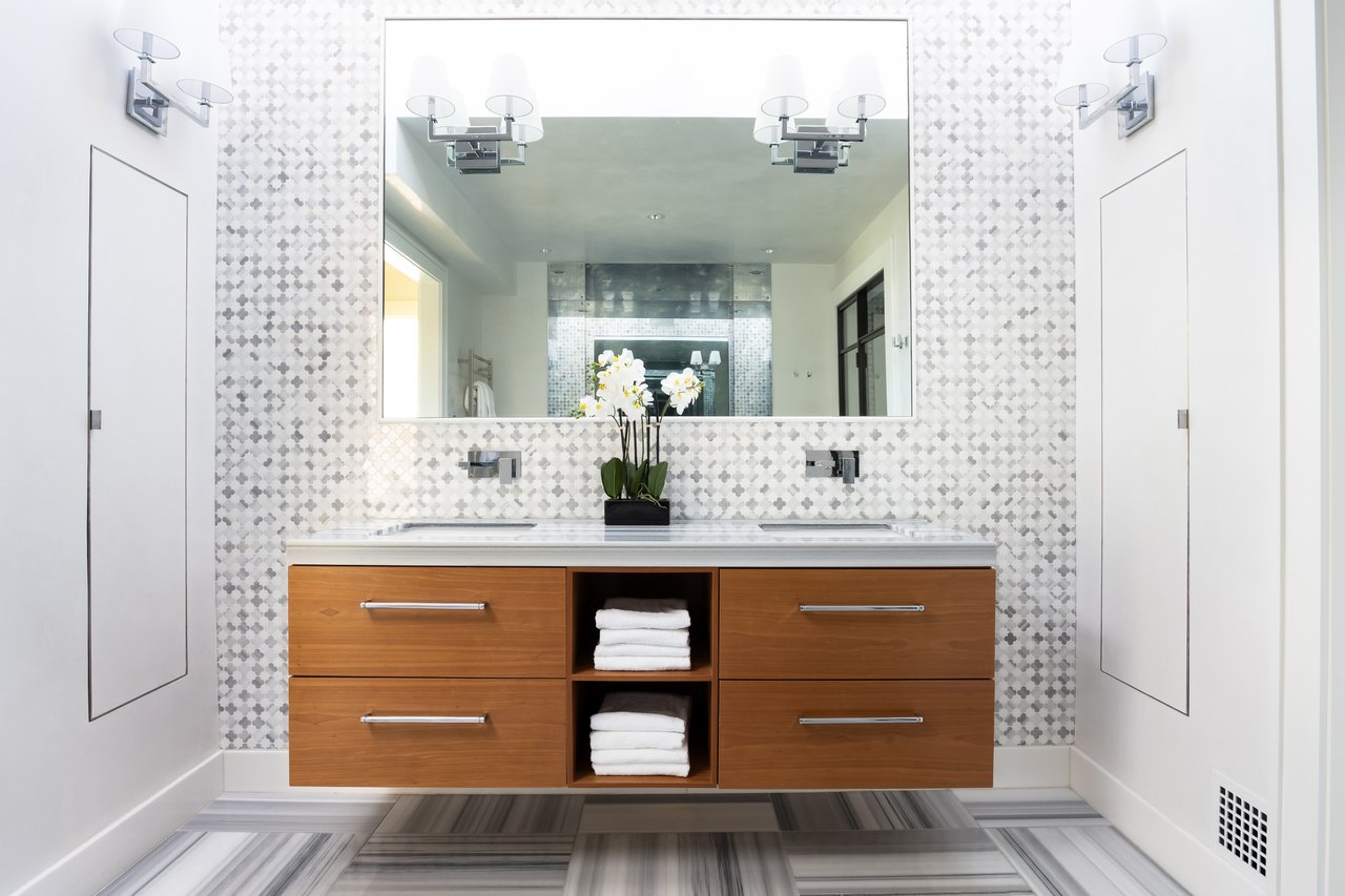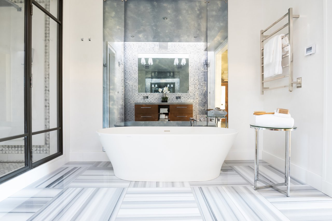 Envisioned in a distinct transitional style, the home’s simple stucco exterior is introduced by a geometric facade punctuated by unbroken, minimalist panes of glass. A private, zen-like front garden sits beneath a lush canopy and combines with a low-walled flagstone patio to create a sanctuary from which to take in the views. An ethereal black and white color palette carries through the light-filled, deceptively large interiors. Rich, dark stained hardwood floors complement dark framing on floor-to-ceiling windows and doors, with handsome millwork and accent lighting throughout. Two sets of French doors in the formal living room open onto the front patio, blurring the lines between indoor and outdoor living. A roaring fireplace and illuminated art niche add warmth and depth. A true functional work of art, the chef’s kitchen features frameless stacked cabinetry, glass-fronted and illuminated on the upper tier, accentuated by stunning brushed brass hardware and concealing ingenious storage solutions behind the unbroken marble slab backsplash. A comprehensive suite of state-of-the-art Wolf and SubZero appliances offers the ultimate in culinary gadgetry. An unbroken gridded wall of glass lines the main level’s substantial informal areas, comprising a generously proportioned family room and casual dining area. A private fireplace infuses coziness into the upper-level primary bedroom, which opens onto a private balcony with sweeping views from two sets of French doors. The dressing room contains extensive built-ins all neatly concealed by full-height doors, framing a large picture window. A blend of contemporary elements with classic materials and workmanship, the primary bath is clad in bold marble tile with an intricate mosaic wall behind the floating double vanity. The freestanding tub sits against a smoked mirror backdrop, and the walk-in shower is enclosed by a gridded glass door. Two additional bedrooms on the upper level are both luxuriously appointed, with one featuring a roaring fireplace and both sharing a bold bathroom. A convenient laundry room completes the level.
